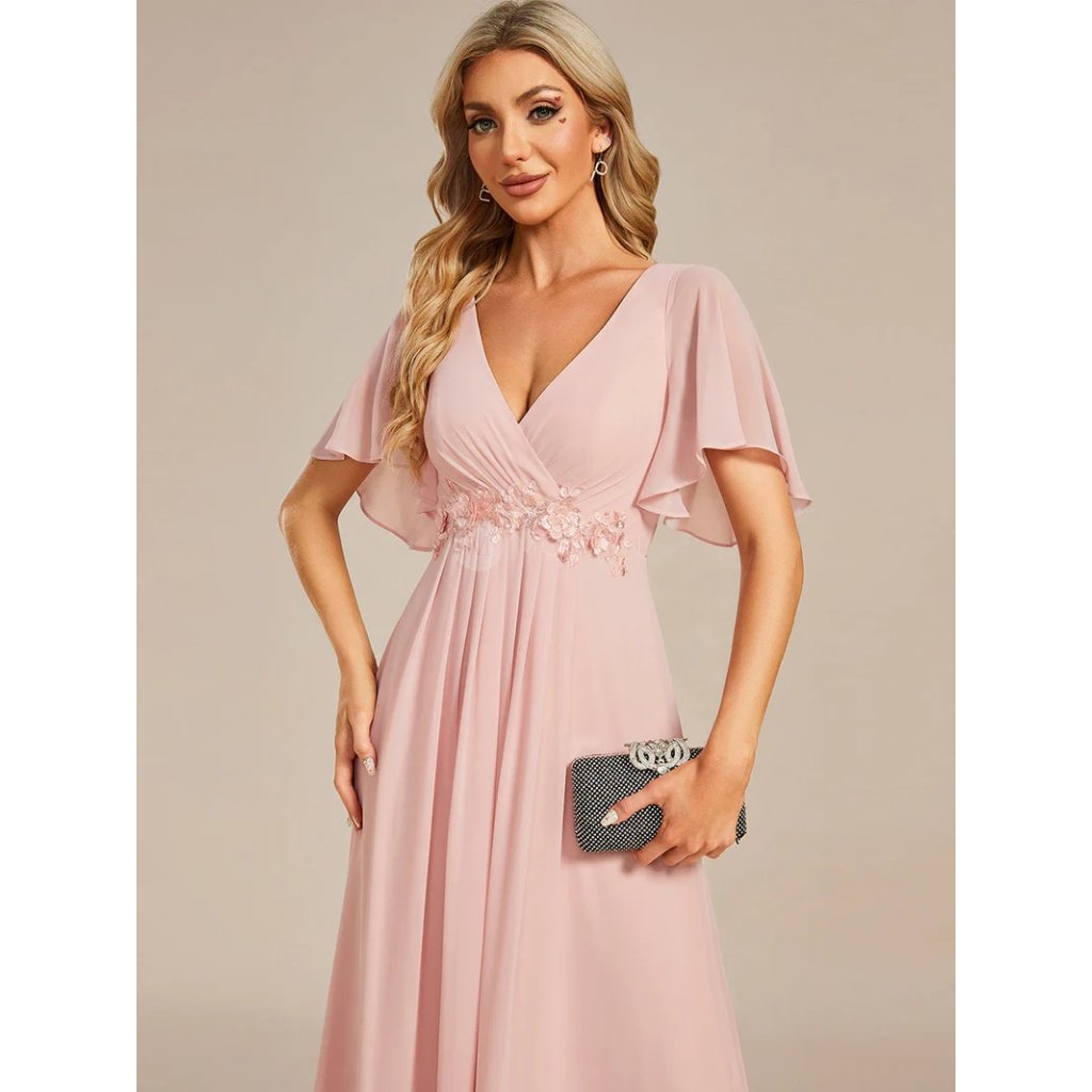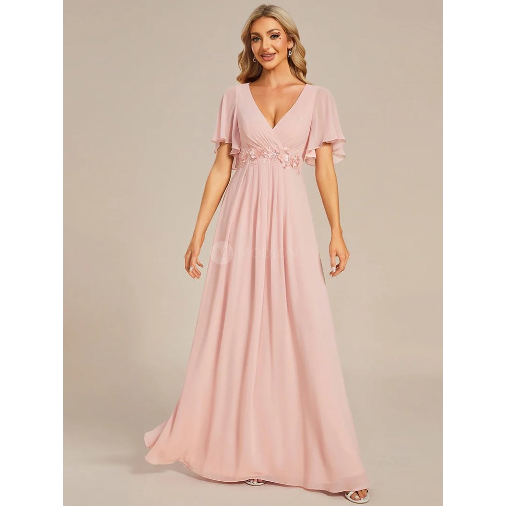 Dlouhé společenské šaty v jemném růžovém odstínu působí něžně a romanticky. Živůtek s véčkovým výstřihem a jemným řasením zvýrazňuje postavu, vysoký pas zdobený krajkovou aplikací s květinovým motivem opticky prodlužuje siluetu. Pod krajkovým pásem se rozbíhají lehké sklady, které dodávají sukni vzdušnost a ladný pohyb. Krátký volánkový rukáv přidává na eleganci a jemně zakrývá ramena.