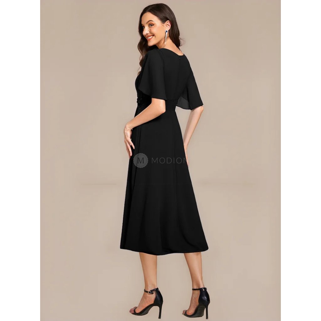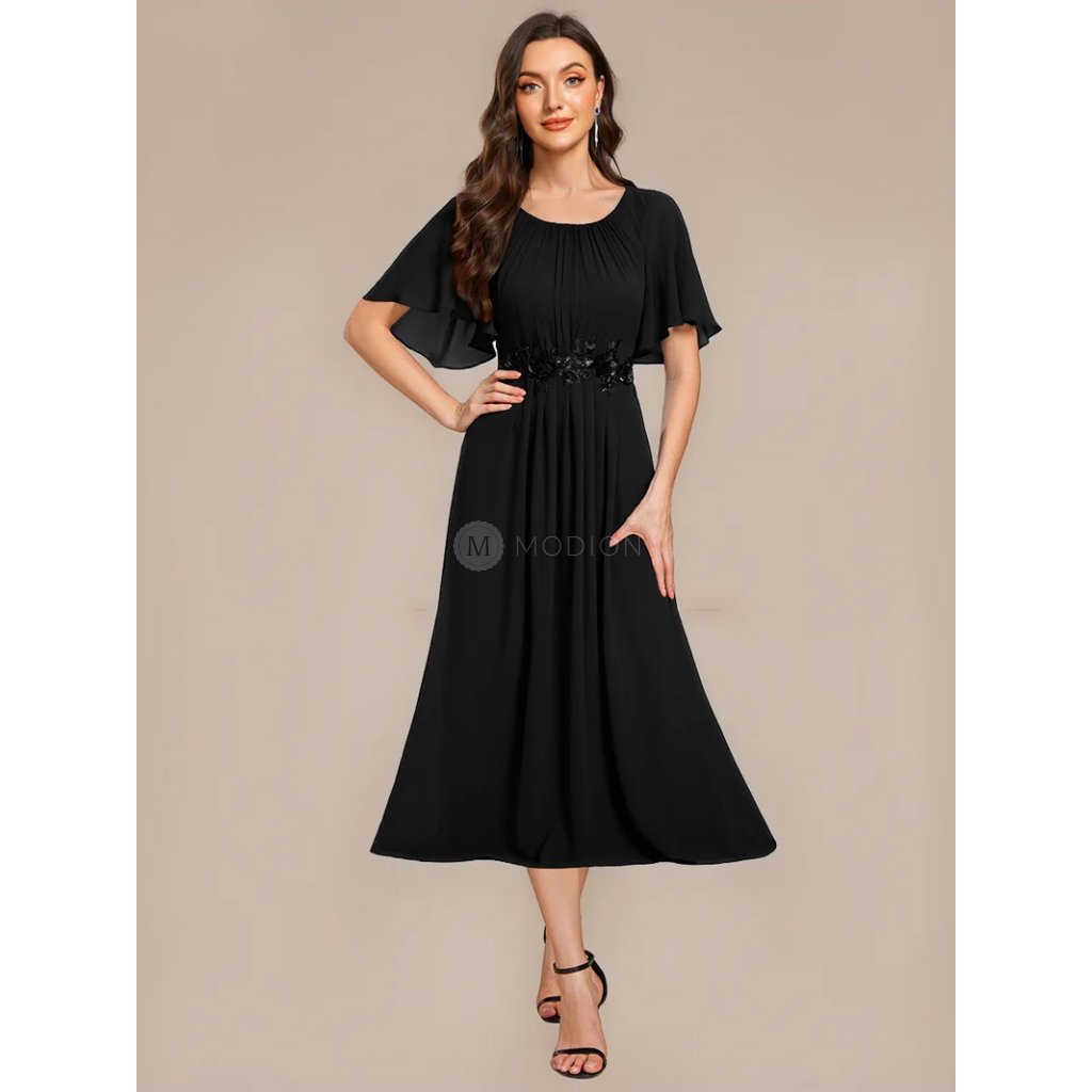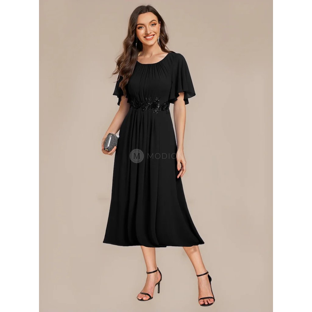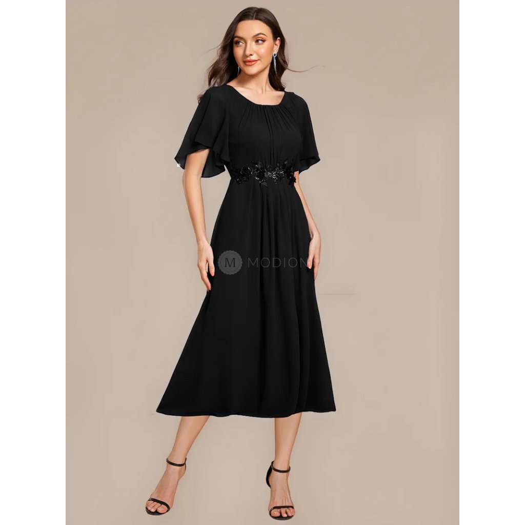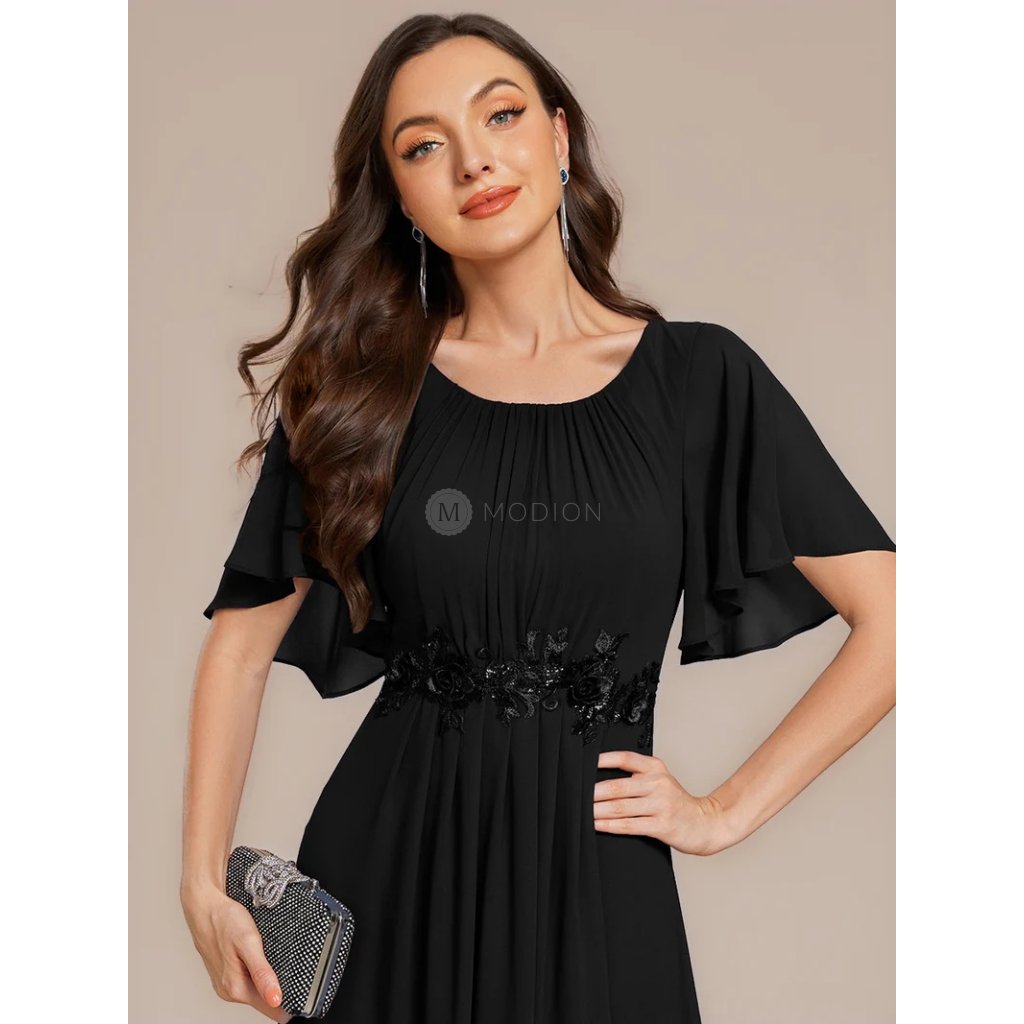 Černé společenské šaty v midi délce vynikají elegancí a nadčasovým stylem. Kulatý výstřih s jemným plisováním působí vznešeně a krátký rukáv dodává lehkost. Pas zdobí krajkový ornament s květinovým motivem, který opticky zeštíhluje postavu. Splývavá šifonová sukně do áčka se krásně vlní při chůzi i tanci. V pase šaty lichotivě tvarují postavu a na zadním díle mají praktické žabičkování, které se přizpůsobí a zajišťuje pohodlí při nošení.