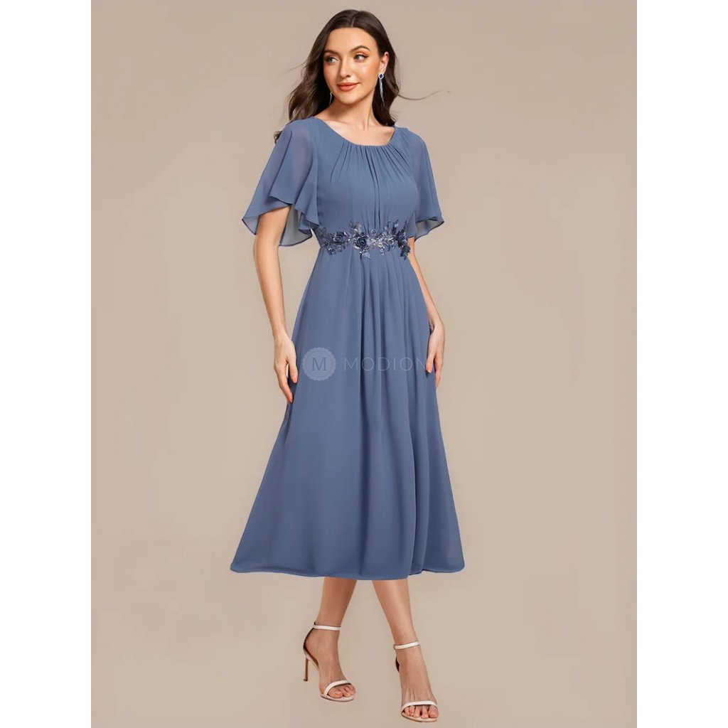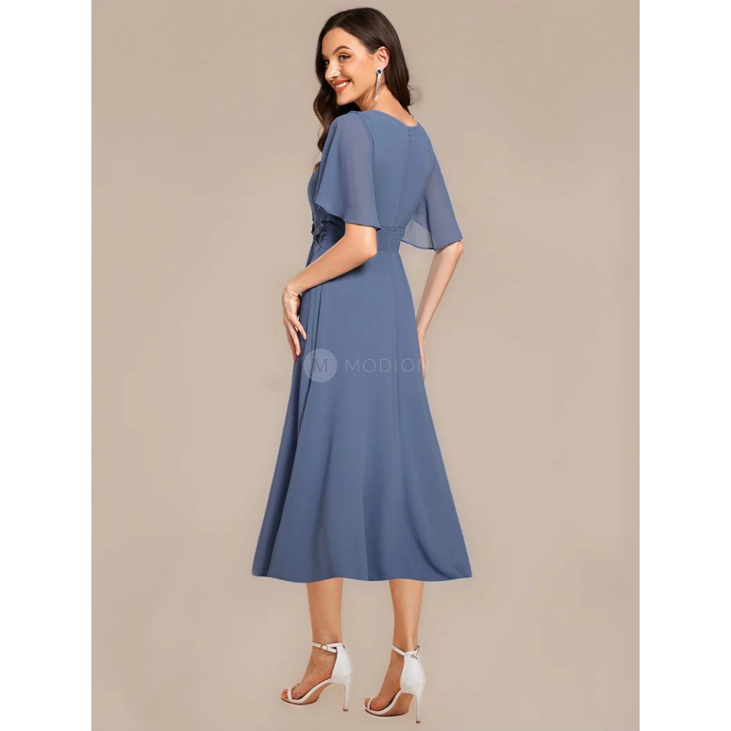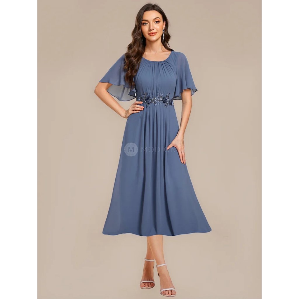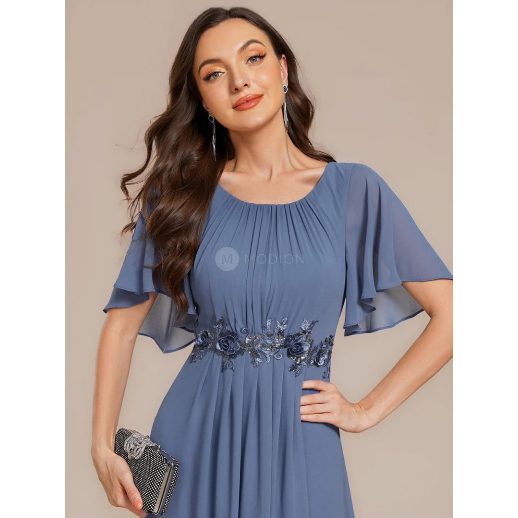 Modrošedé společenské šaty v midi délce působí noblesně a jemně. Kulatý výstřih s plisováním přidává na originalitě, krátký rukáv je pohodlný a elegantní. Pas zvýrazňuje krajková aplikace s květinovým motivem, která lichotí postavě. Áčková šifonová sukně se ladně vlní při pohybu. V pase šaty lichotivě tvarují postavu a na zadním díle mají praktické žabičkování, které se přizpůsobí a zajišťuje pohodlí při nošení.