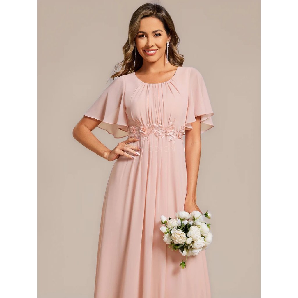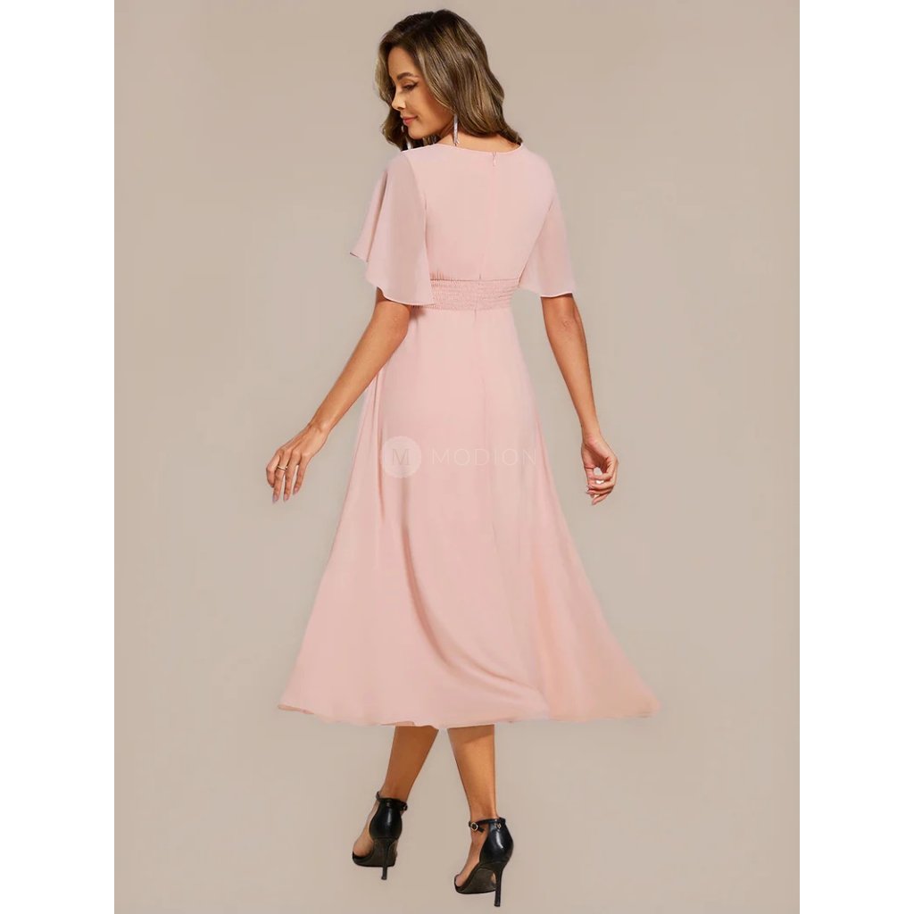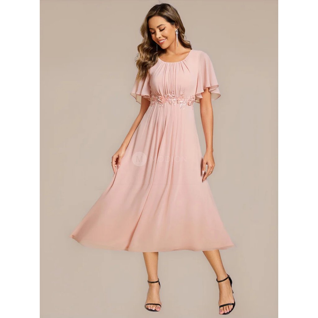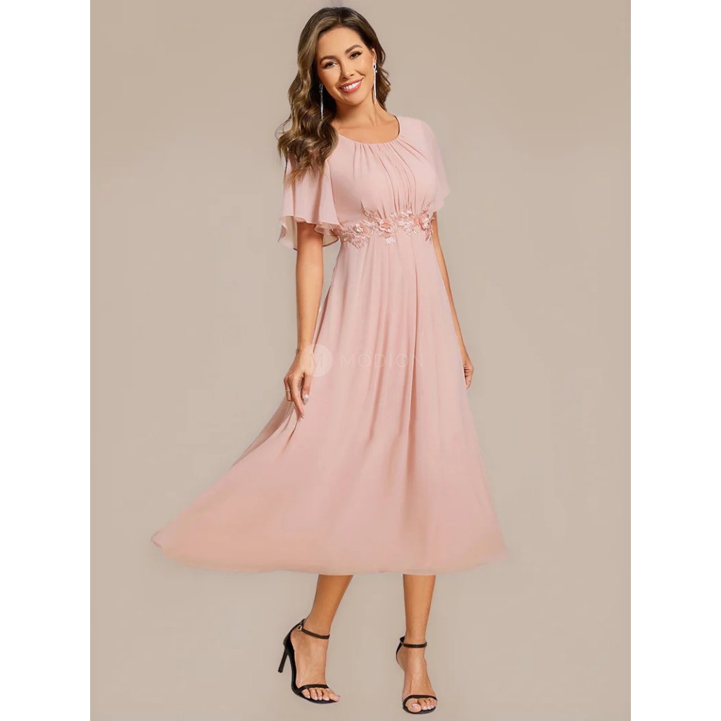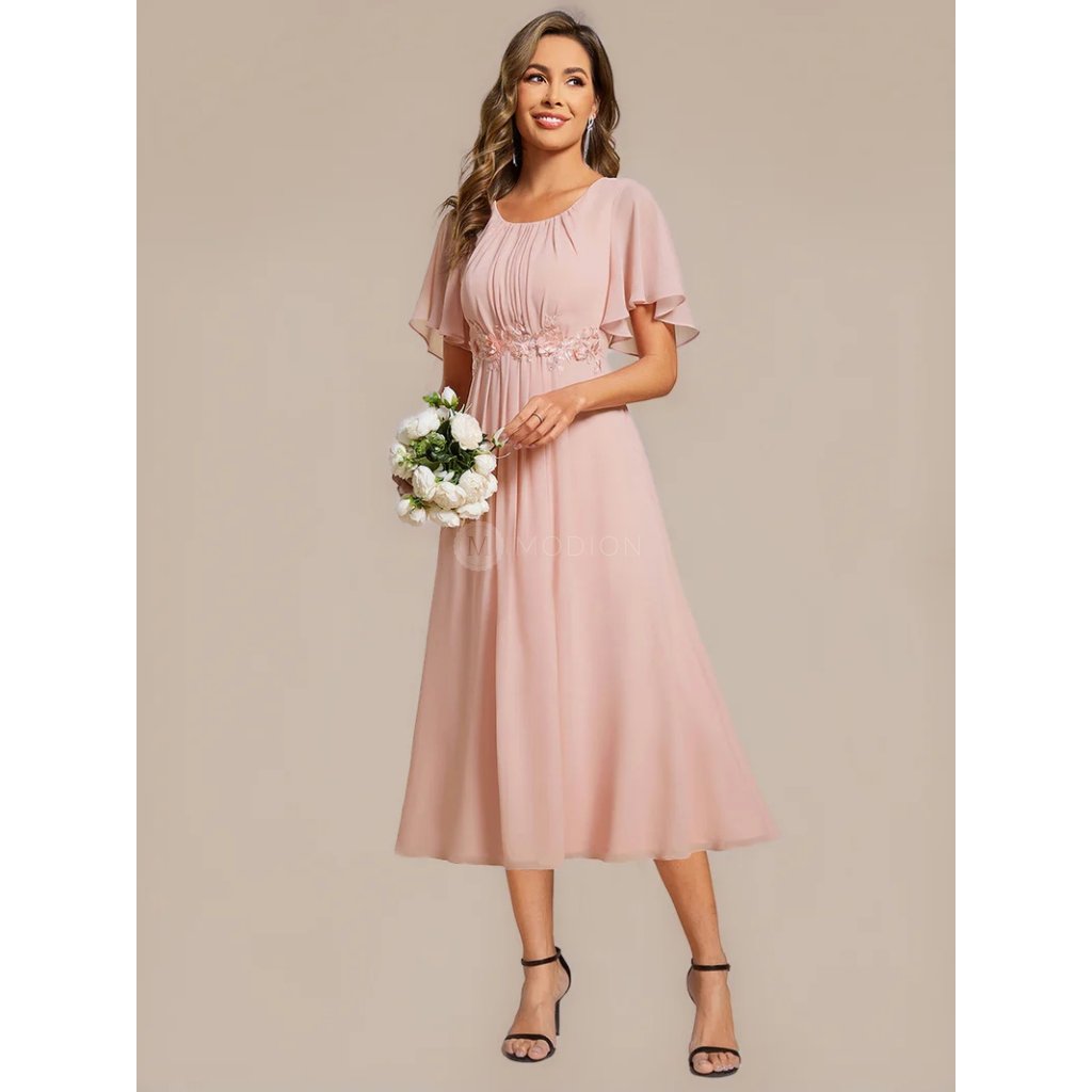 Růžové společenské šaty v midi délce působí romanticky a něžně. Kulatý výstřih s plisováním podtrhuje ženský půvab, krátký rukáv přidává na lehkosti. Pas zdobí vyšívaná krajková aplikace s květinovým ornamentem, která opticky zeštíhluje postavu. Áčková šifonová sukně se elegantně vlní při chůzi i tanci. V pase šaty lichotivě tvarují postavu a na zadním díle mají praktické žabičkování, které se přizpůsobí a zajišťuje pohodlí při nošení.