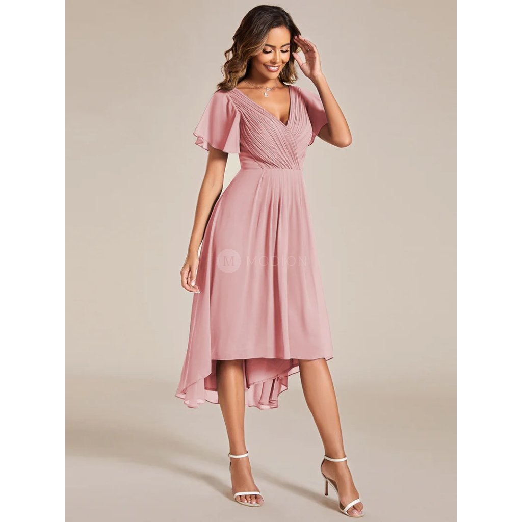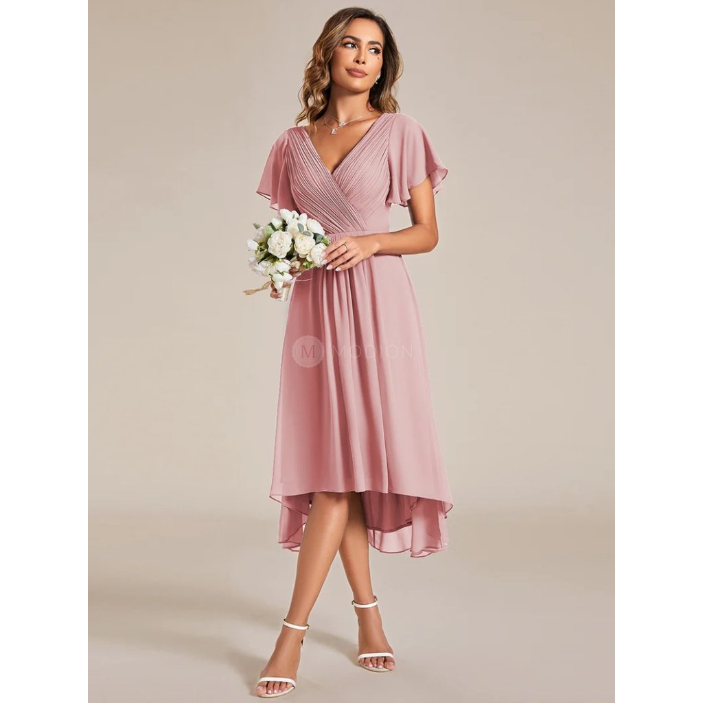 Světlé starorůžové šaty z lehkého šifonu působí jemně a romanticky. Výstřih do V zvýrazňuje dekolt, plisovaný živůtek dodává modelu něžný detail a krátké rukávy poskytují pohodlné zakrytí paží. V pase jsou šaty zdobené sklady, které lichotí postavě, a splývavá asymetrická sukně s delším zadním dílem se při chůzi ladně pohybuje a působí vzdušně.