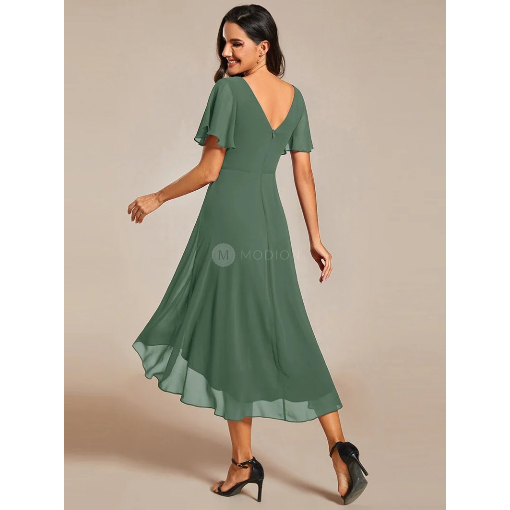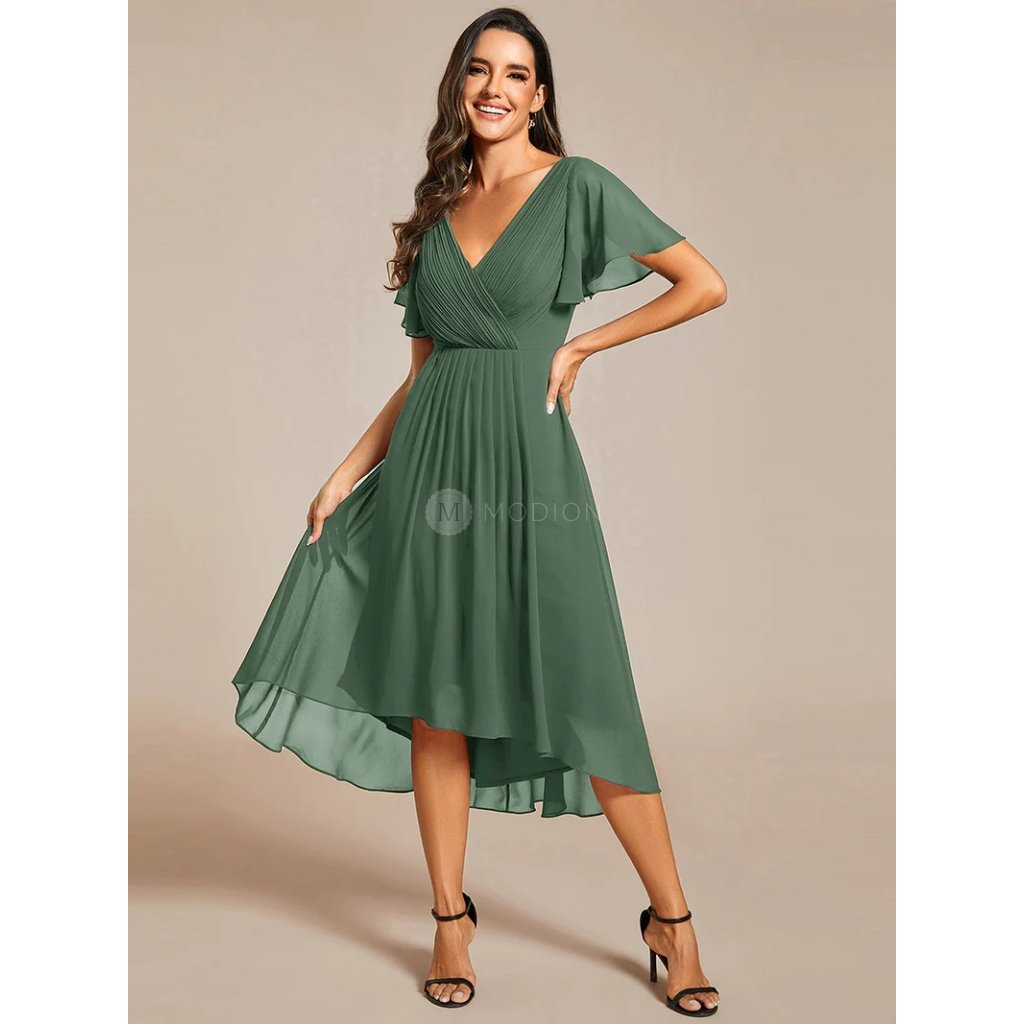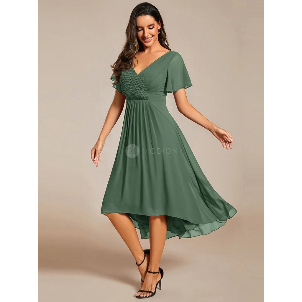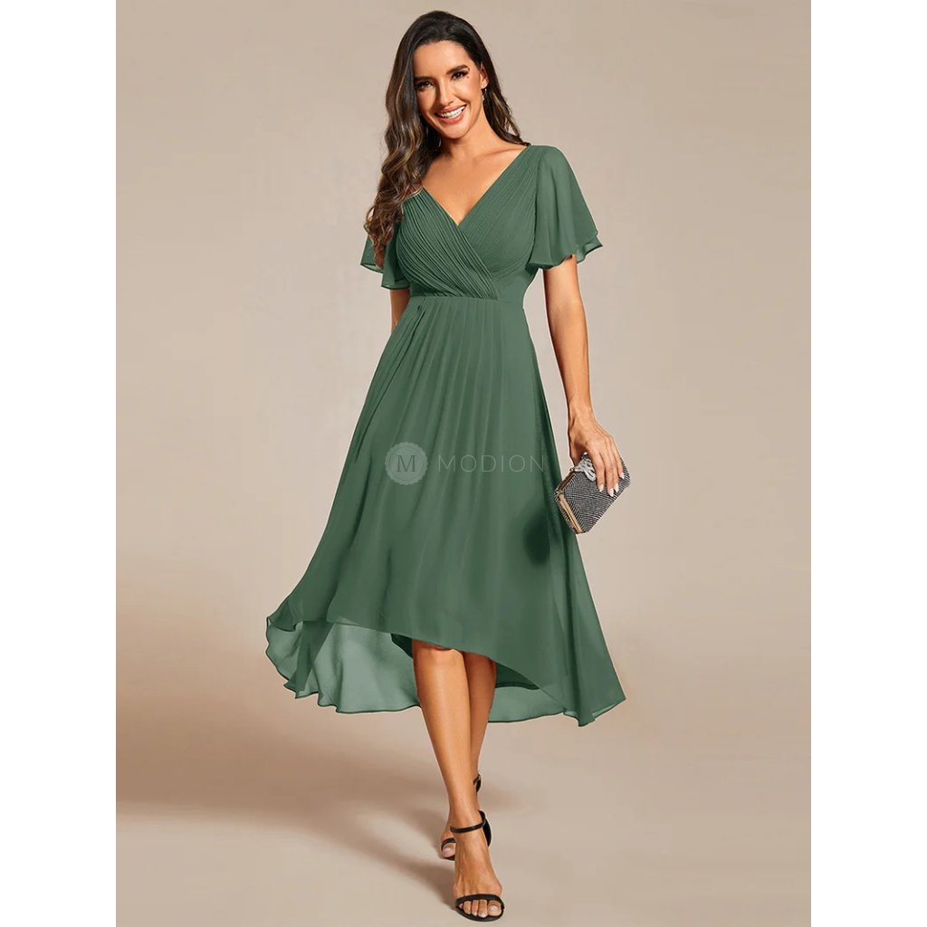 Zelené společenské šaty v sofistikovaném eukalyptovém odstínu působí svěže, jemně a přirozeně elegantně. Šifonový materiál se krásně vlní při pohybu a spolu s plisovaným živůtkem vytváří lichotivou siluetu. Výstřih do V a krátké rukávy působí decentně, zatímco asymetrická sukně dodává moderní nádech.