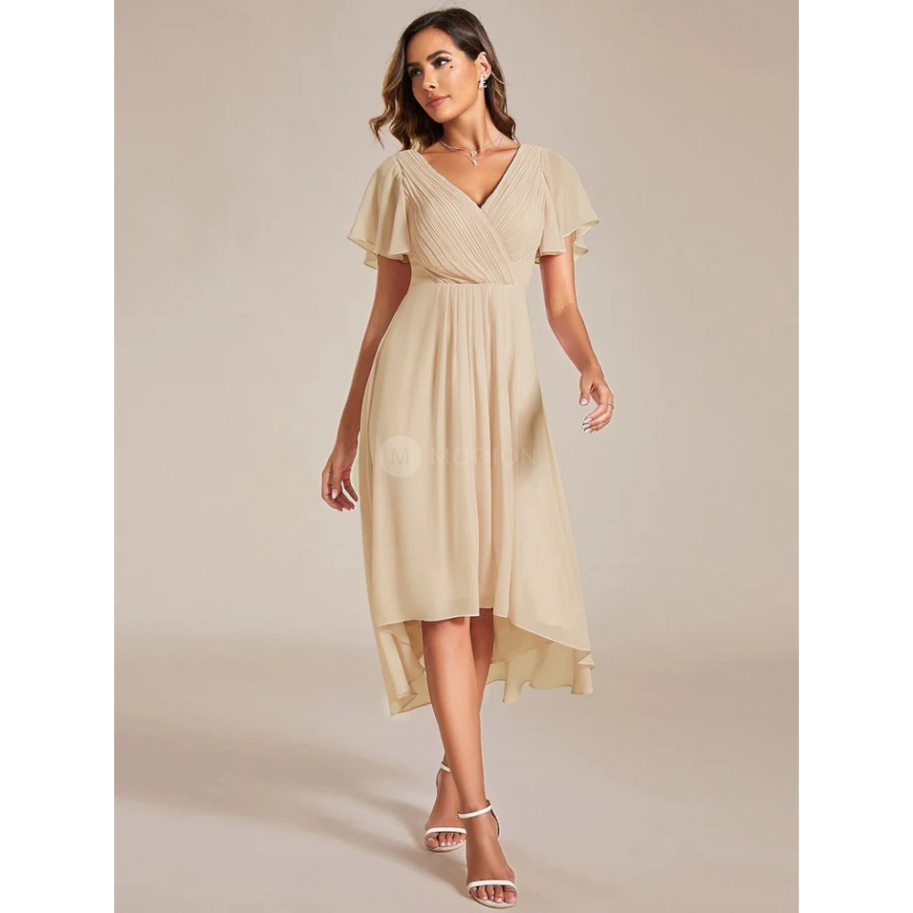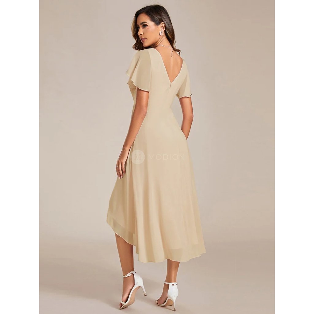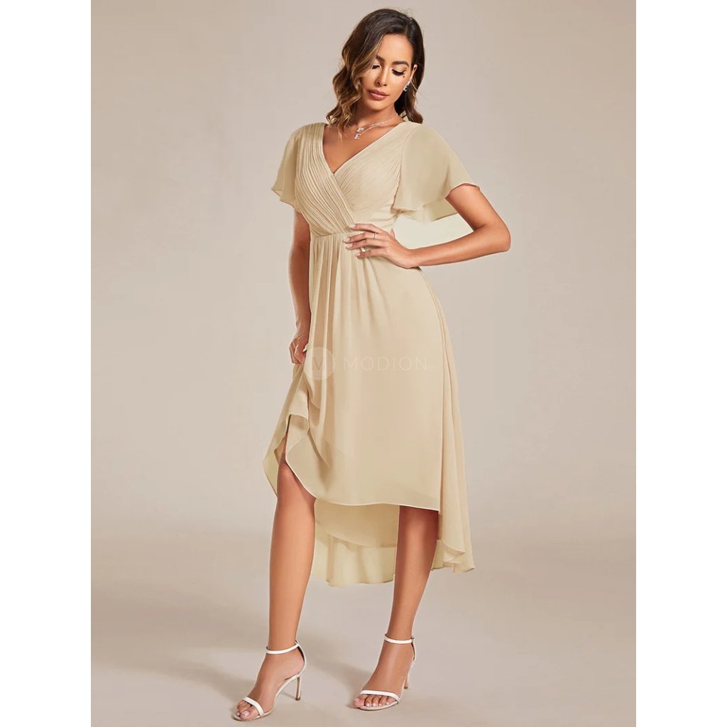 Béžové šampaň šaty z lehkého šifonu působí jemně a elegantně. Výstřih do V zvýrazňuje dekolt, plisovaný živůtek dodává modelu ženský půvab a krátké rukávy poskytují pohodlné zakrytí paží. V pase jsou šaty zdobené sklady, které tvarují postavu, a splývavá asymetrická sukně s delší zadní částí se při chůzi ladně pohybuje.