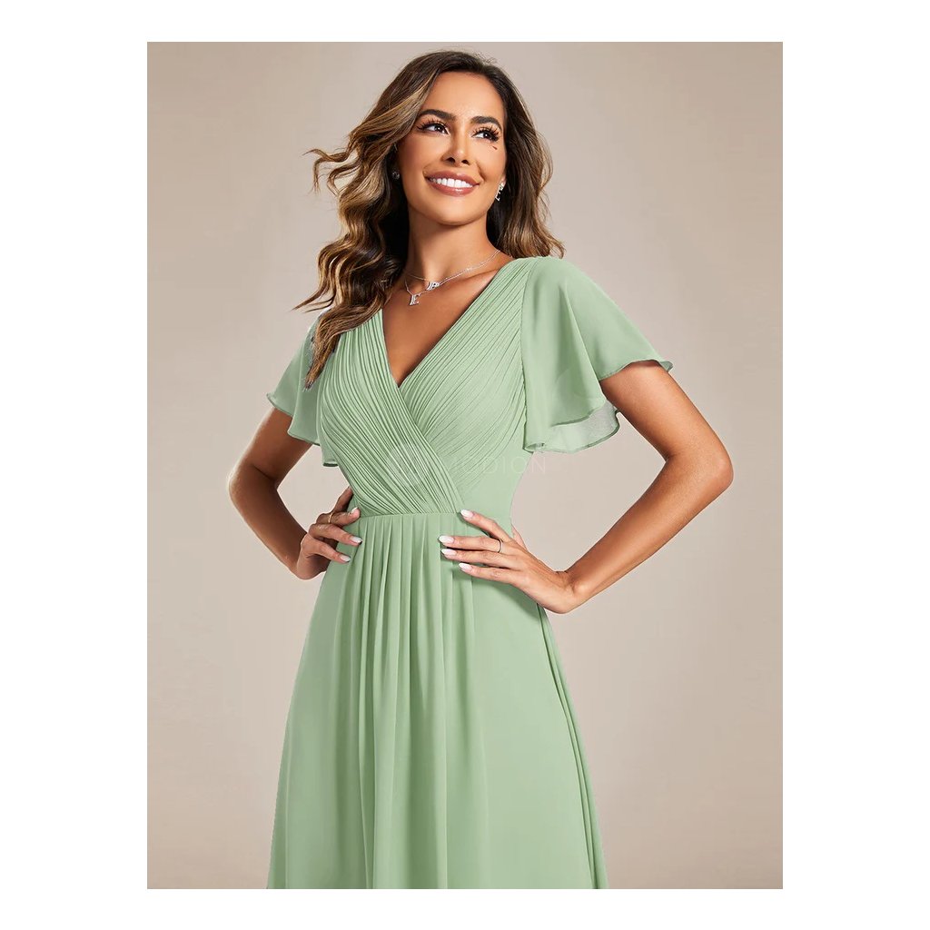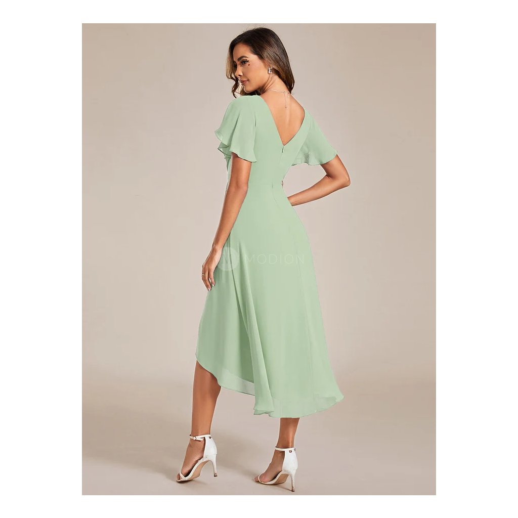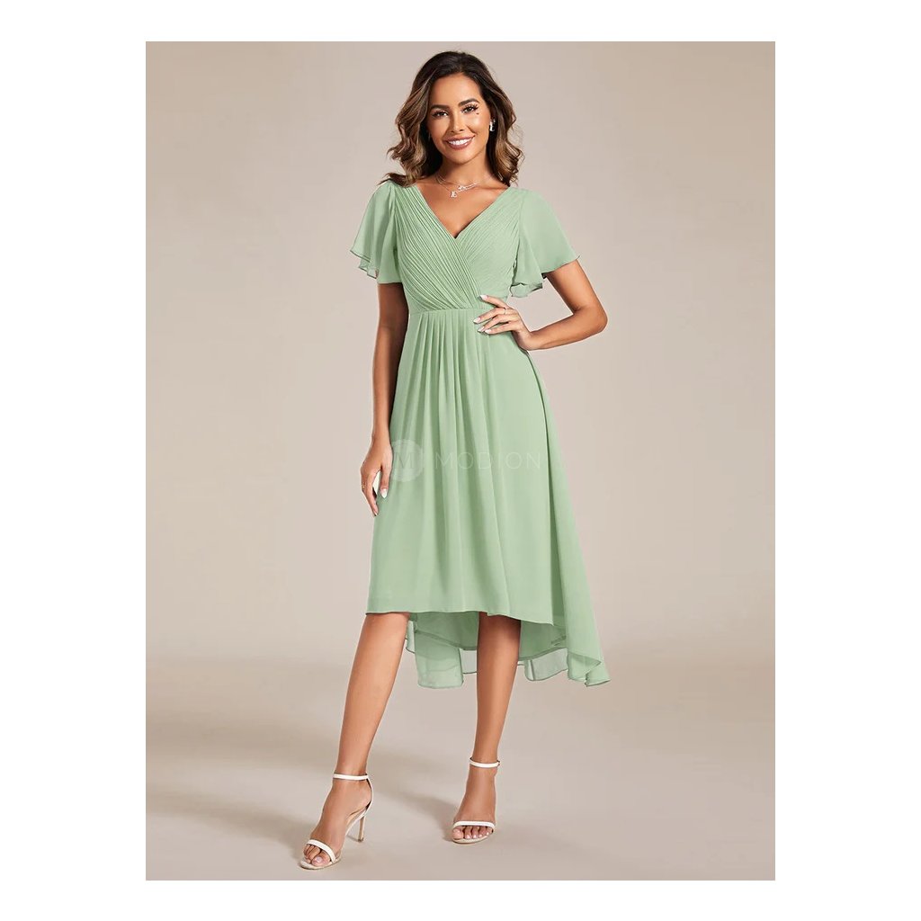 Světle zelené mátové šaty z lehkého šifonu působí svěže a jemně. Výstřih do V zvýrazňuje dekolt, plisovaný živůtek přidává modelu eleganci a krátké rukávy poskytují pohodlné zakrytí paží. V pase jsou šaty zdobené sklady, které lichotí postavě, a splývavá asymetrická sukně s delším zadním dílem se při chůzi ladně pohybuje a působí vzdušně.