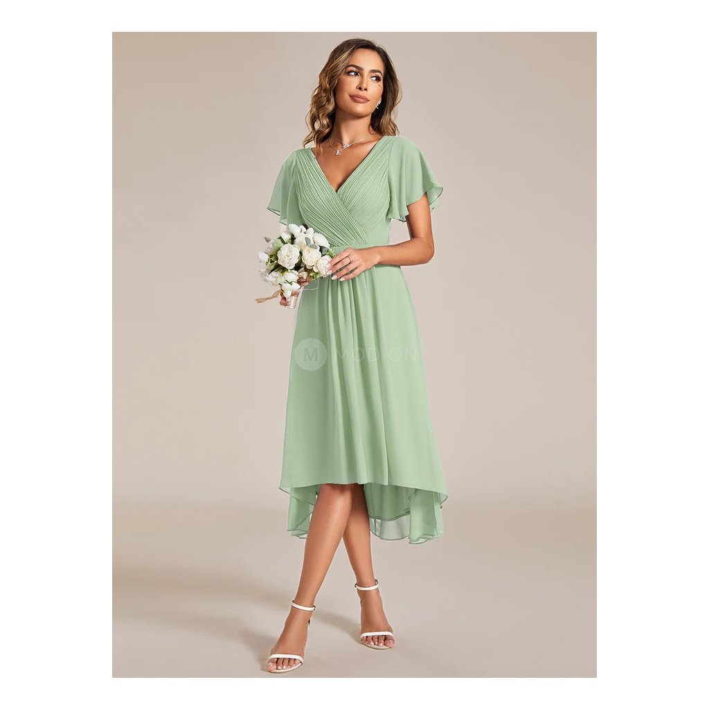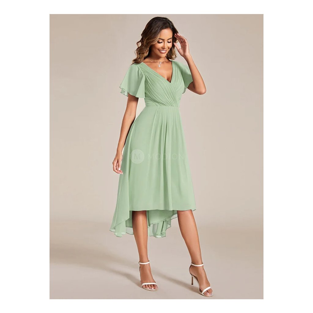 Mátově zelené společenské midi šaty Jessamine ze šifonu působí svěže a velmi žensky. Asymetrická sukně krásně splývá, volánkové rukávy dodají lehkost. Ideální na svatbu, večírek i večeři.
