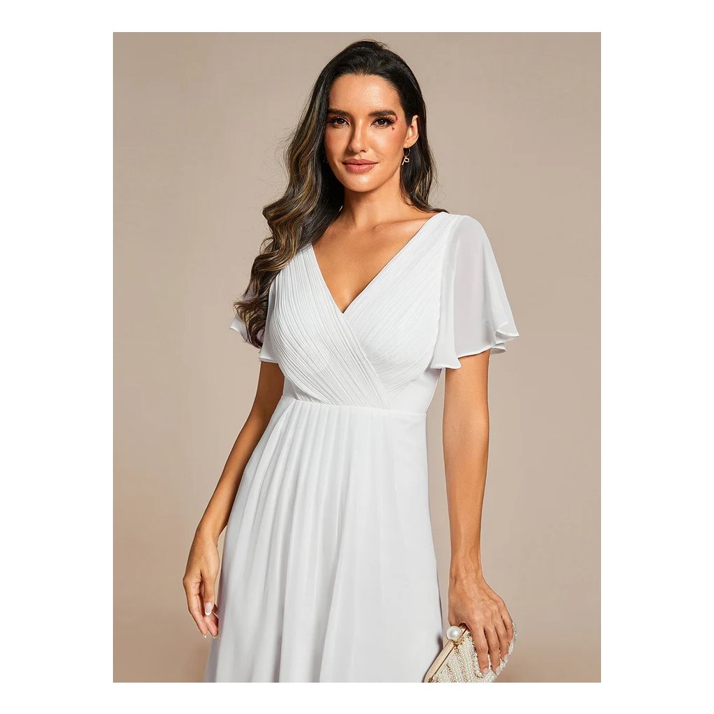 Bílé šaty z lehkého šifonu působí čistě a elegantně. Výstřih do V krásně zvýrazňuje dekolt, plisovaný živůtek dodává modelu jemný detail a krátké rukávy poskytují pohodlné zakrytí paží. V pase jsou šaty zdobené sklady, které lichotí postavě, a splývavá asymetrická sukně s delším zadním dílem se při chůzi ladně pohybuje.