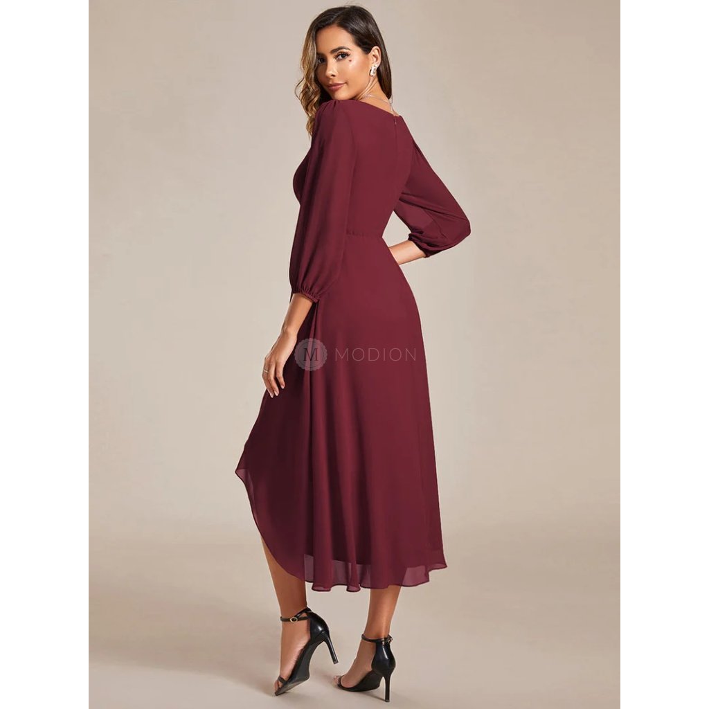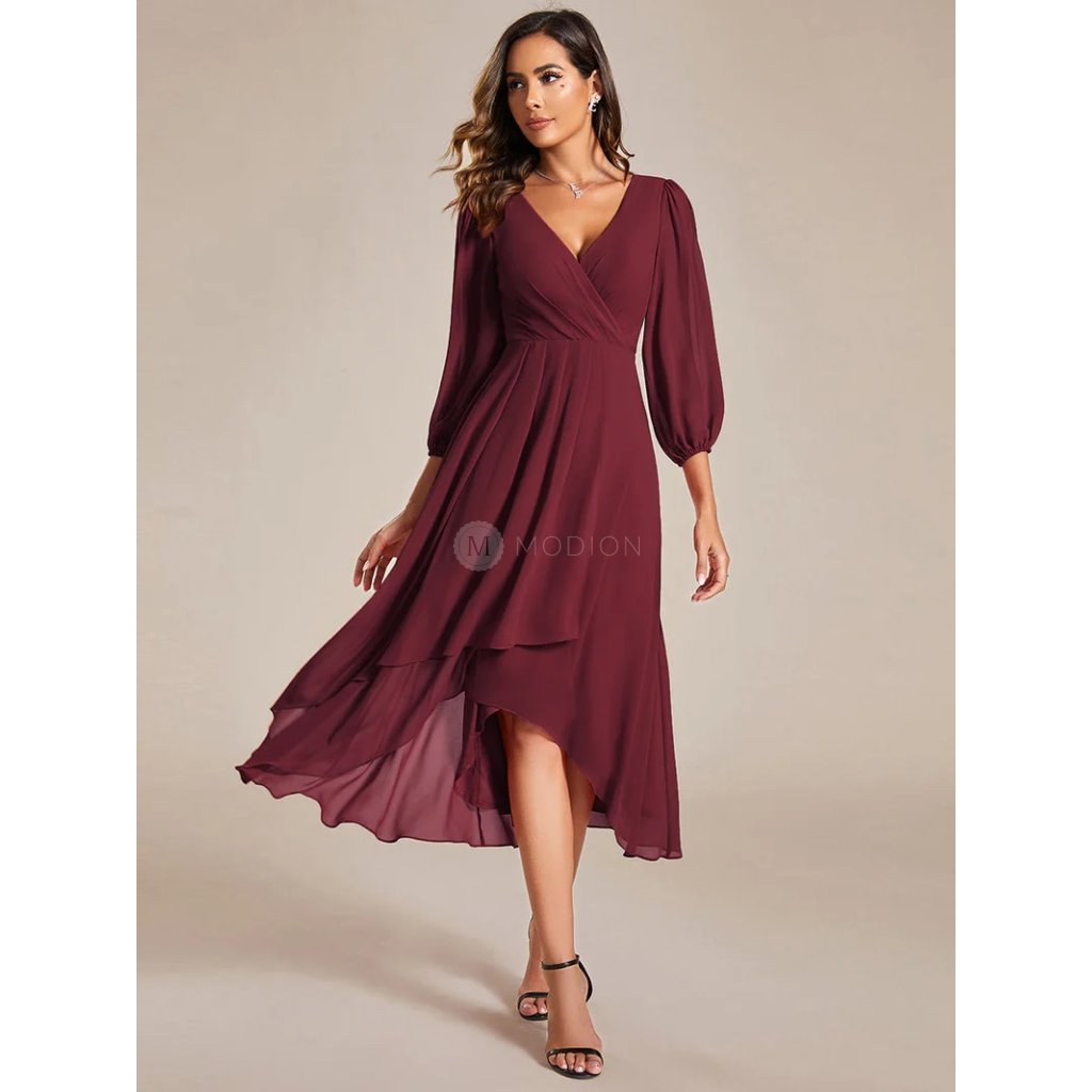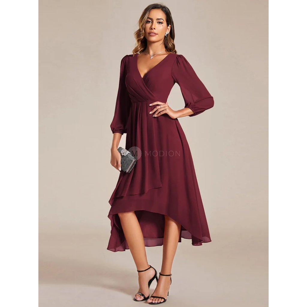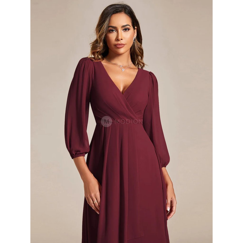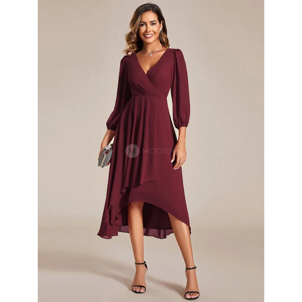 Červené vínové šaty z lehkého šifonu působí smyslně a elegantně. Výstřih do V zvýrazňuje dekolt, plisovaný živůtek dodává šatům ženský půvab a sklady v pase lichotí postavě. Dlouhé rukávy zakončené gumičkou poskytují pohodlné zakrytí paží a zároveň působí vzdušně. Splývavá asymetrická sukně s kratší přední a delší zadní částí se při chůzi ladně pohybuje a dodává šatům slavnostní charakter.