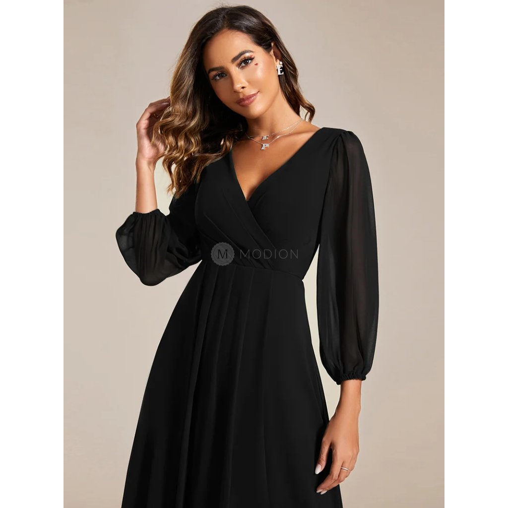 Černé šaty z lehkého šifonu působí nadčasově a elegantně. Výstřih do V zvýrazňuje dekolt, plisovaný živůtek dodává šatům jemnost a sklady v pase lichotí postavě. Dlouhé rukávy zakončené gumičkou poskytují pohodlné zakrytí paží a zároveň působí vzdušně. Splývavá asymetrická sukně s kratší přední a delší zadní částí se při chůzi ladně pohybuje a podtrhuje slavnostní charakter šatů.