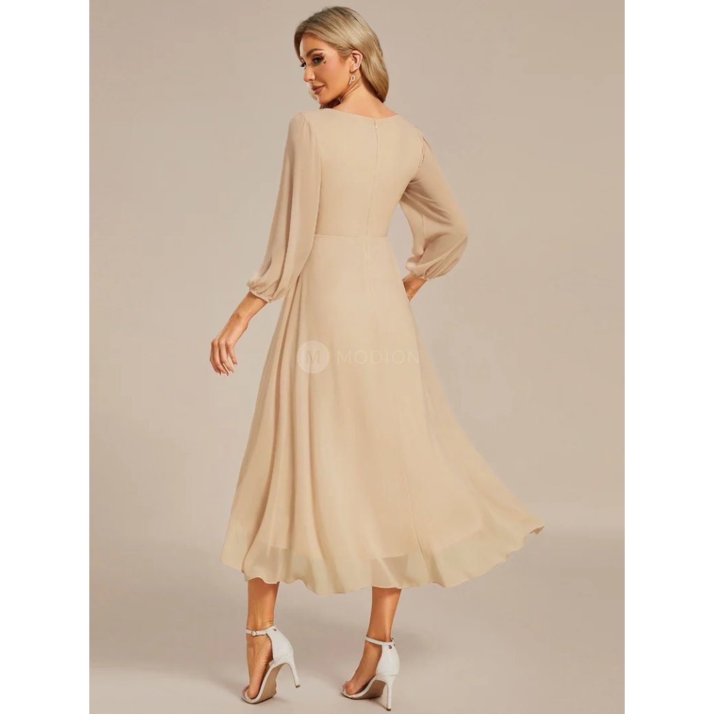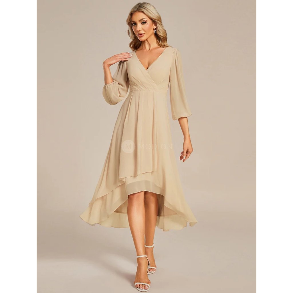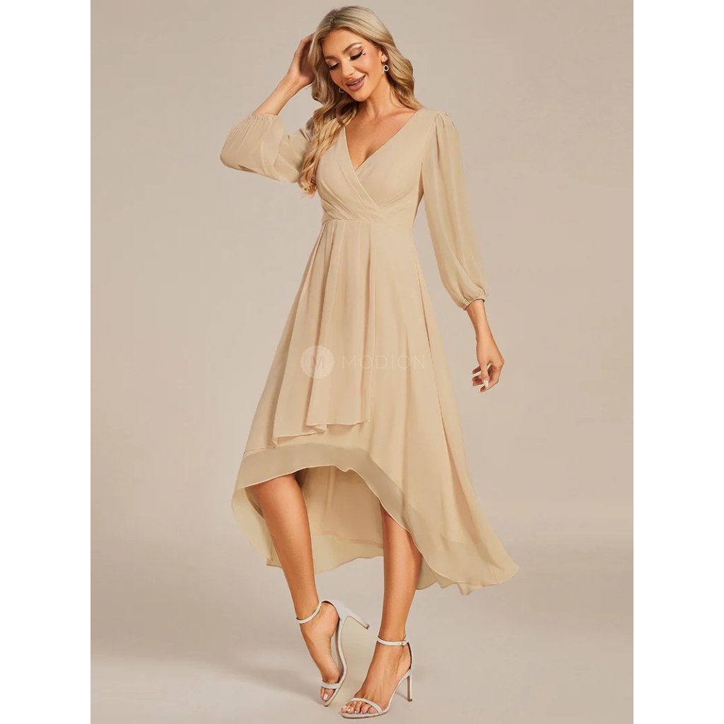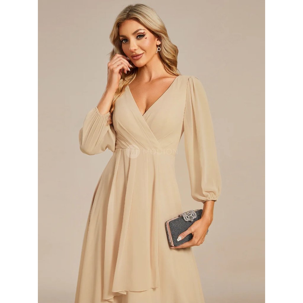 Béžové šaty z lehkého šifonu působí jemně a elegantně. Výstřih do V zvýrazňuje dekolt, plisovaný živůtek dodává šatům sofistikovaný detail a sklady v pase lichotí postavě. Dlouhé rukávy zakončené gumičkou působí vzdušně a zároveň poskytují pohodlné zakrytí paží. Splývavá asymetrická sukně s kratší přední a delší zadní částí se při chůzi ladně pohybuje a podtrhuje slavnostní charakter šatů.