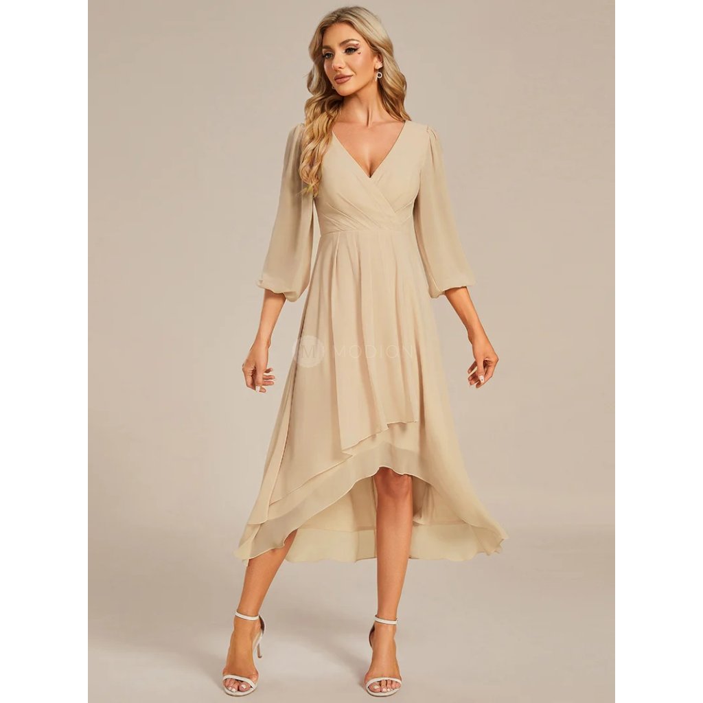 Společenské šaty Vivienne: Béžové midi šaty z lehkého šifonu s 3/4 rukávy a asymetrickou sukní na svatbu i ples.
