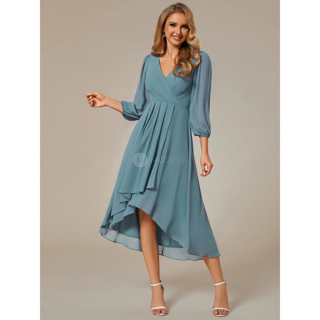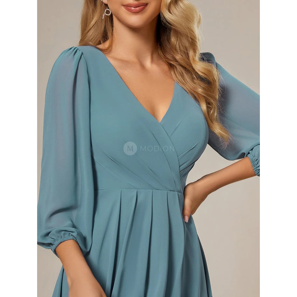 Modrozelené petrolejové šaty z lehkého šifonu působí elegantně a originálně. Výstřih do V zvýrazňuje dekolt, plisovaný živůtek dodává šatům jemný detail a sklady v pase lichotí postavě. Dlouhé rukávy zakončené gumičkou poskytují pohodlné zakrytí paží a zároveň působí vzdušně. Splývavá asymetrická sukně s kratší přední a delší zadní částí se při chůzi ladně pohybuje a podtrhuje slavnostní charakter šatů.
