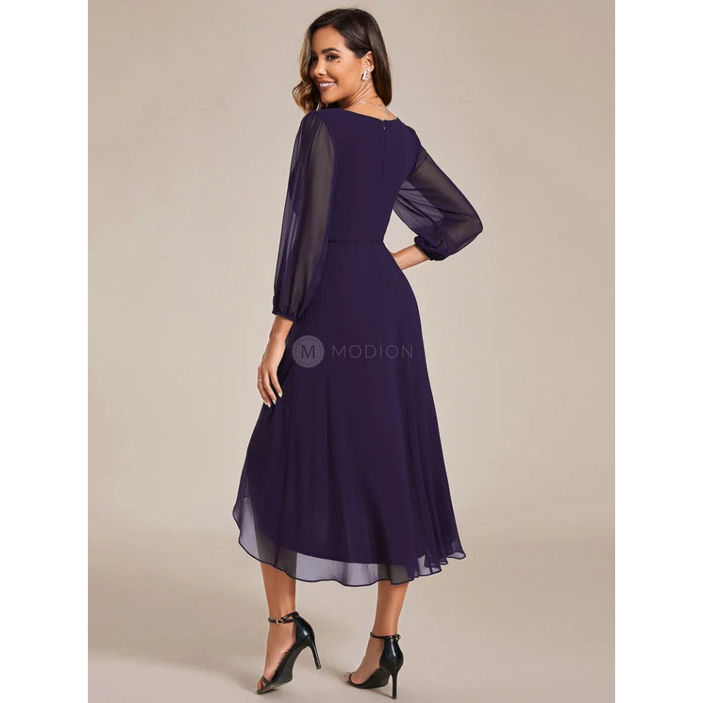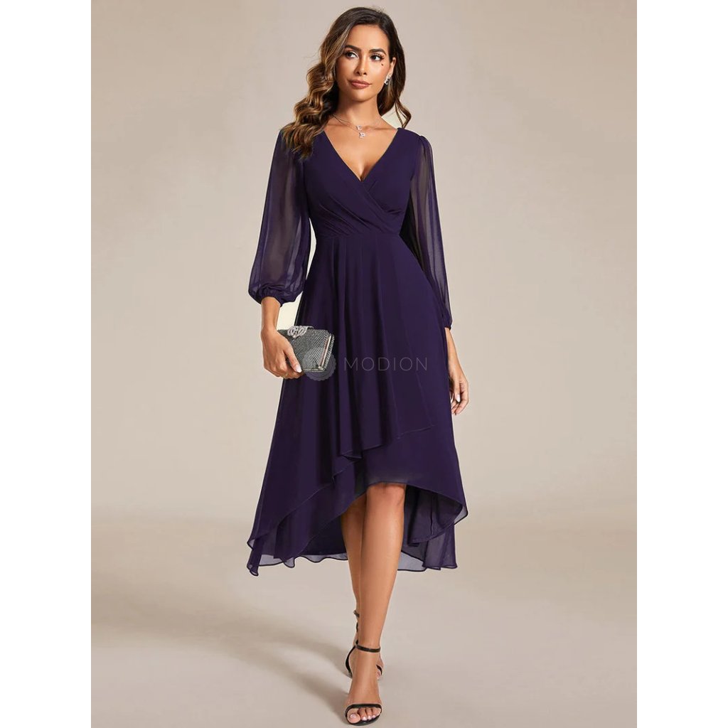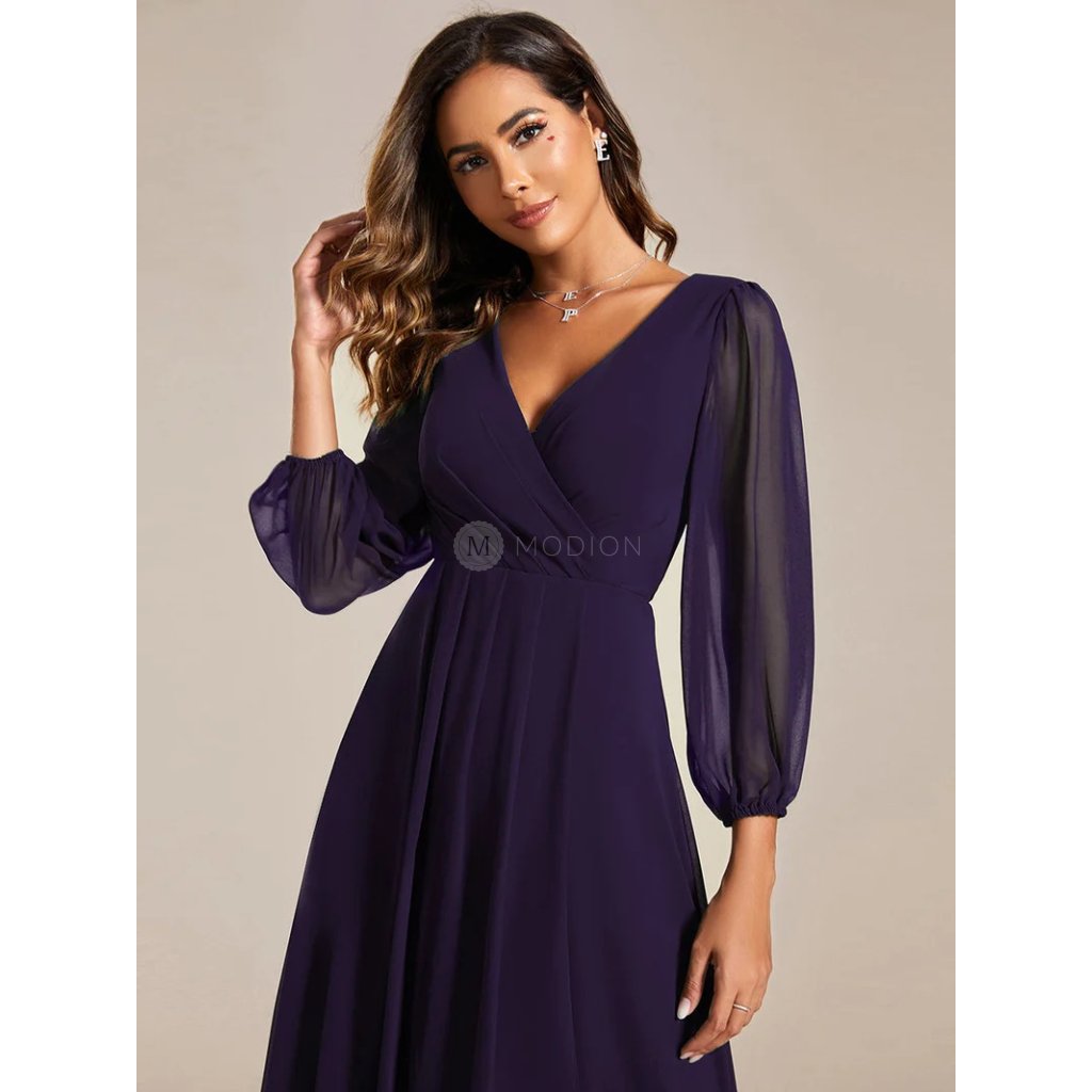 Tmavě fialové šaty z lehkého šifonu působí výrazně a elegantně. Výstřih do V zvýrazňuje dekolt, plisovaný živůtek dodává šatům jemnost a sklady v pase lichotí postavě. Dlouhé rukávy zakončené gumičkou poskytují pohodlné zakrytí paží a zároveň působí vzdušně. Splývavá asymetrická sukně s kratší přední a delší zadní částí se při chůzi ladně pohybuje a dodává šatům noblesní vzhled.