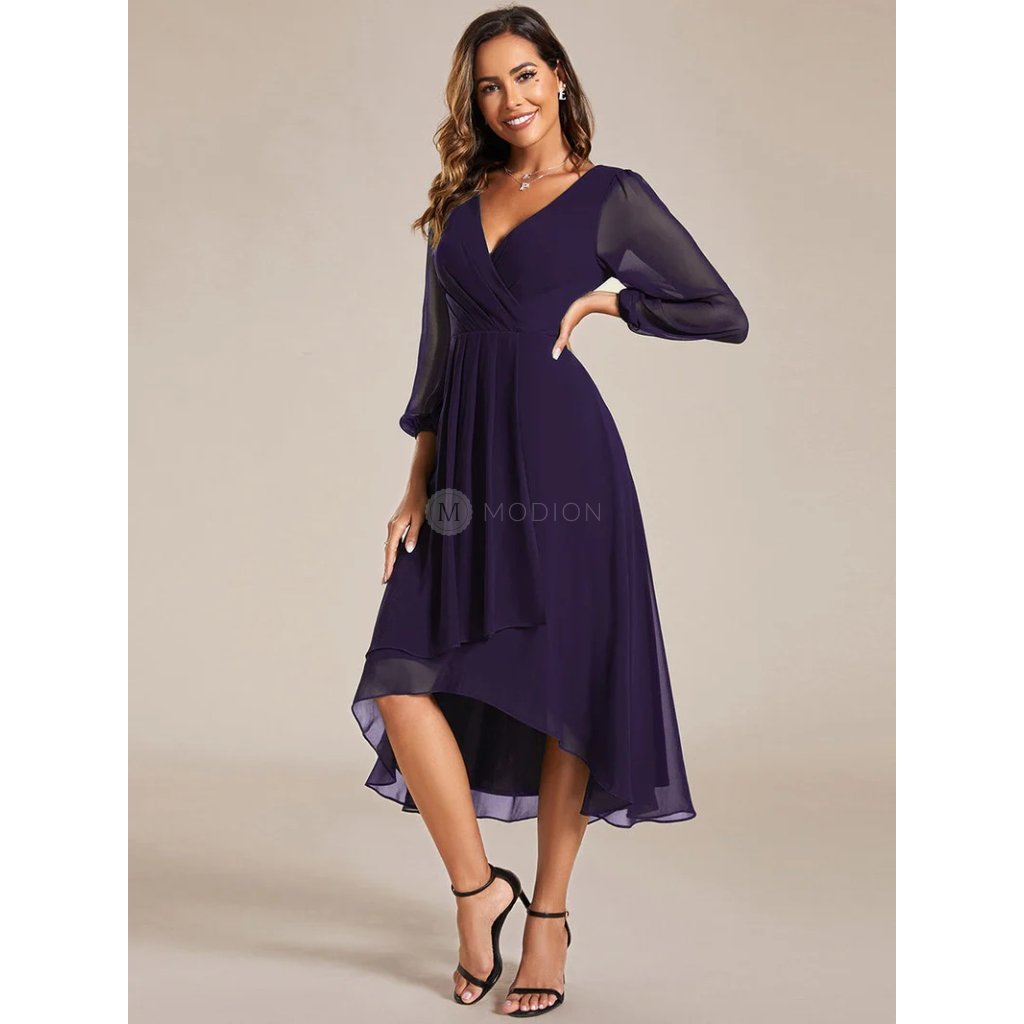 Společenské šaty Vivienne: Fialové midi šaty z lehkého šifonu s 3/4 rukávy a asymetrickou sukní na svatbu i ples.
