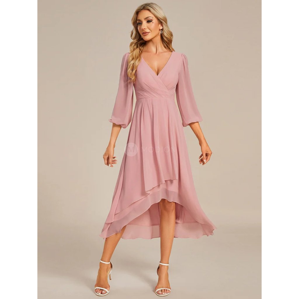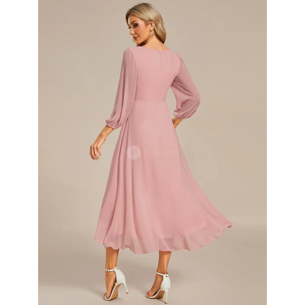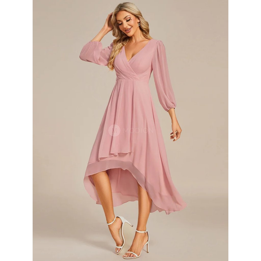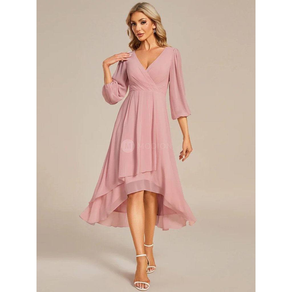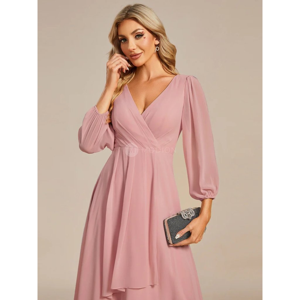 Světlé starorůžové šaty z lehkého šifonu působí jemně a romanticky. Výstřih do V zvýrazňuje dekolt, plisovaný živůtek dodává šatům ženský půvab a sklady v pase lichotí postavě. Dlouhé rukávy zakončené gumičkou poskytují decentní zakrytí paží a zároveň působí vzdušně. Splývavá asymetrická sukně s kratší přední částí v midi délce a delší zadní částí se při chůzi ladně pohybuje a podtrhuje elegantní vzhled šatů.