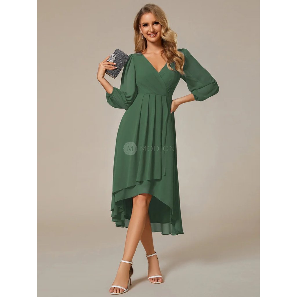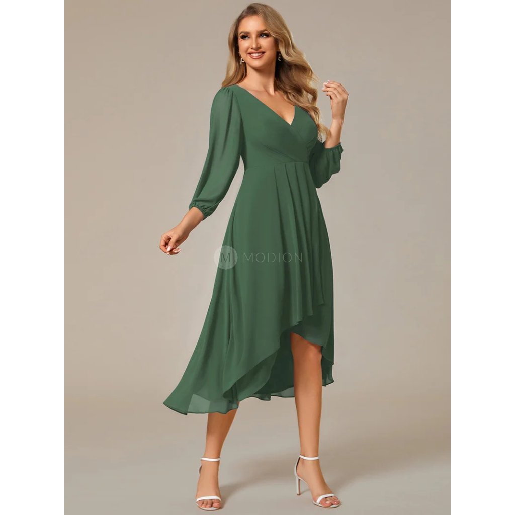 Společenské šaty Vivienne: Eukalyptově zelené midi šaty z lehkého šifonu s 3/4 rukávy a asymetrickou sukní na svatbu i ples.