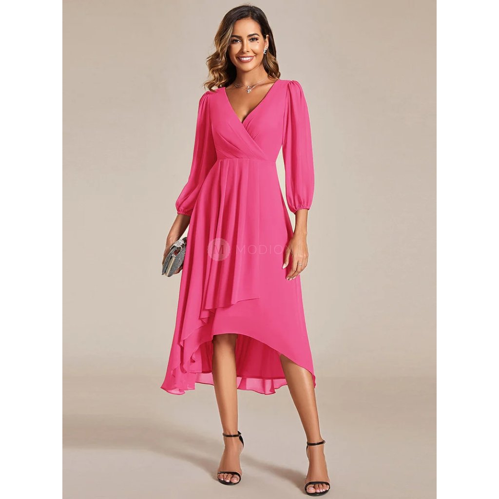 Růžové cyklamenové šaty z lehkého šifonu působí odvážně a svěže. Výstřih do V zvýrazňuje dekolt, plisovaný živůtek dodává šatům ženský půvab a sklady v pase lichotí postavě. Dlouhé rukávy zakončené gumičkou poskytují pohodlné zakrytí paží a zároveň působí vzdušně. Asymetrická sukně má kratší přední část v midi délce a delší zadní část, která se při chůzi ladně pohybuje.