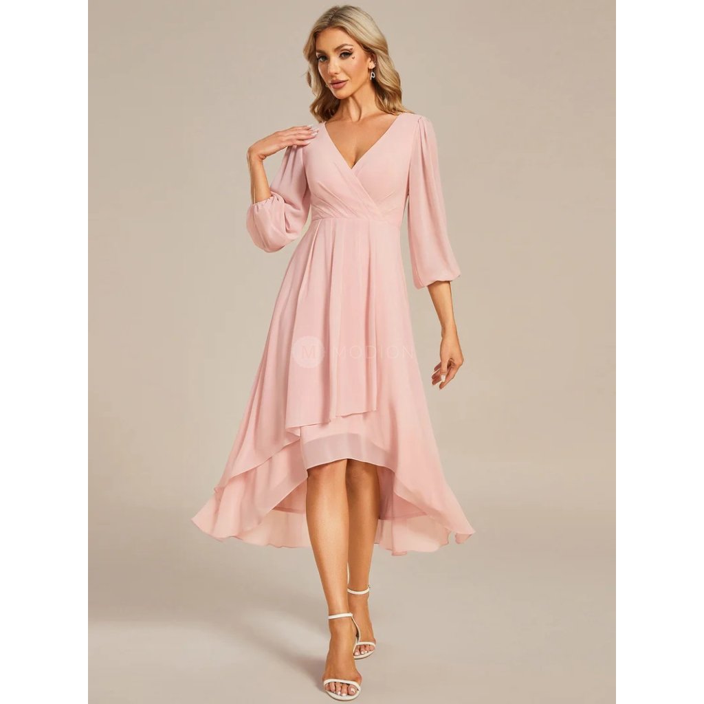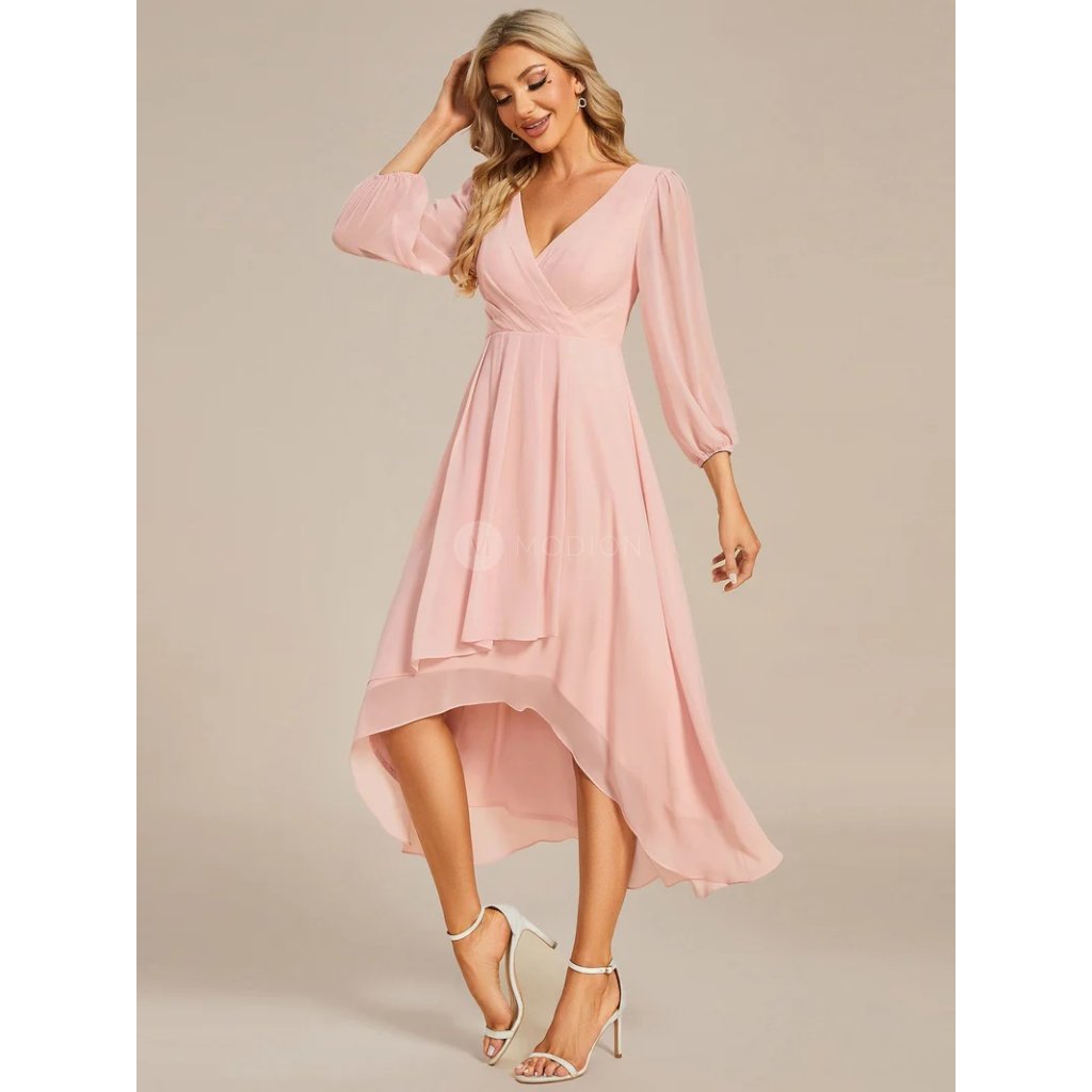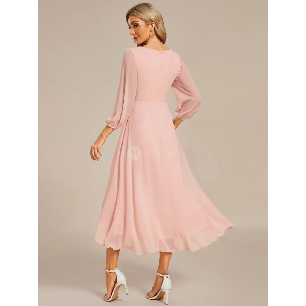 Světle růžové šaty z lehkého šifonu působí něžně a romanticky. Výstřih do V zvýrazňuje dekolt, plisovaný živůtek dodává šatům jemný detail a sklady v pase lichotí postavě. Dlouhé rukávy zakončené gumičkou poskytují pohodlné zakrytí paží a zároveň působí lehce a vzdušně. Splývavá asymetrická sukně s kratší přední částí v midi délce a delší zadní částí se při chůzi ladně pohybuje.