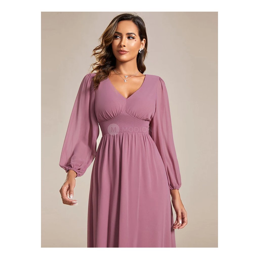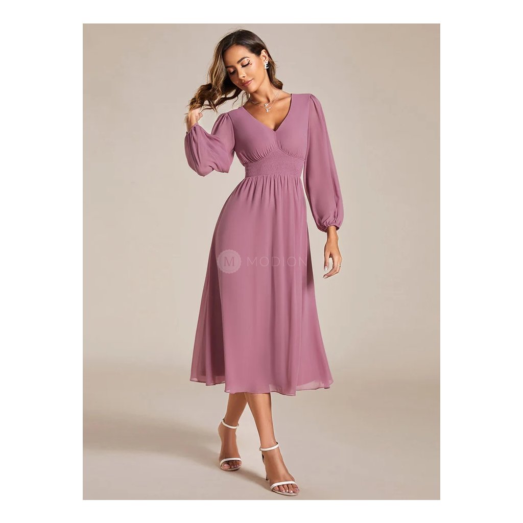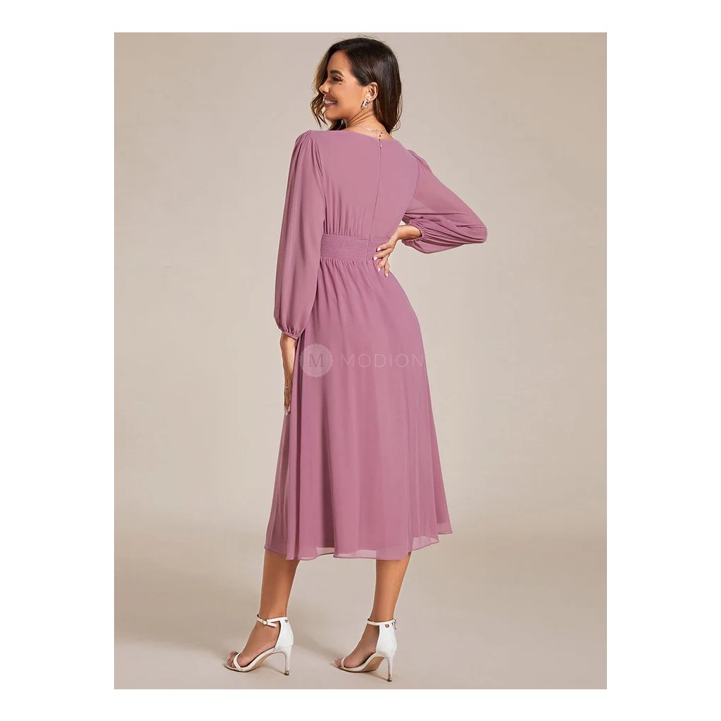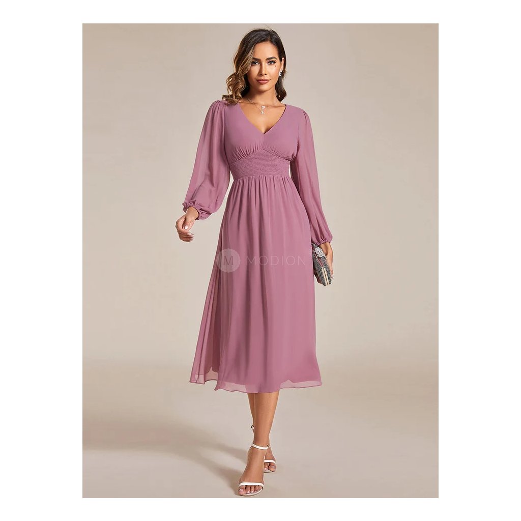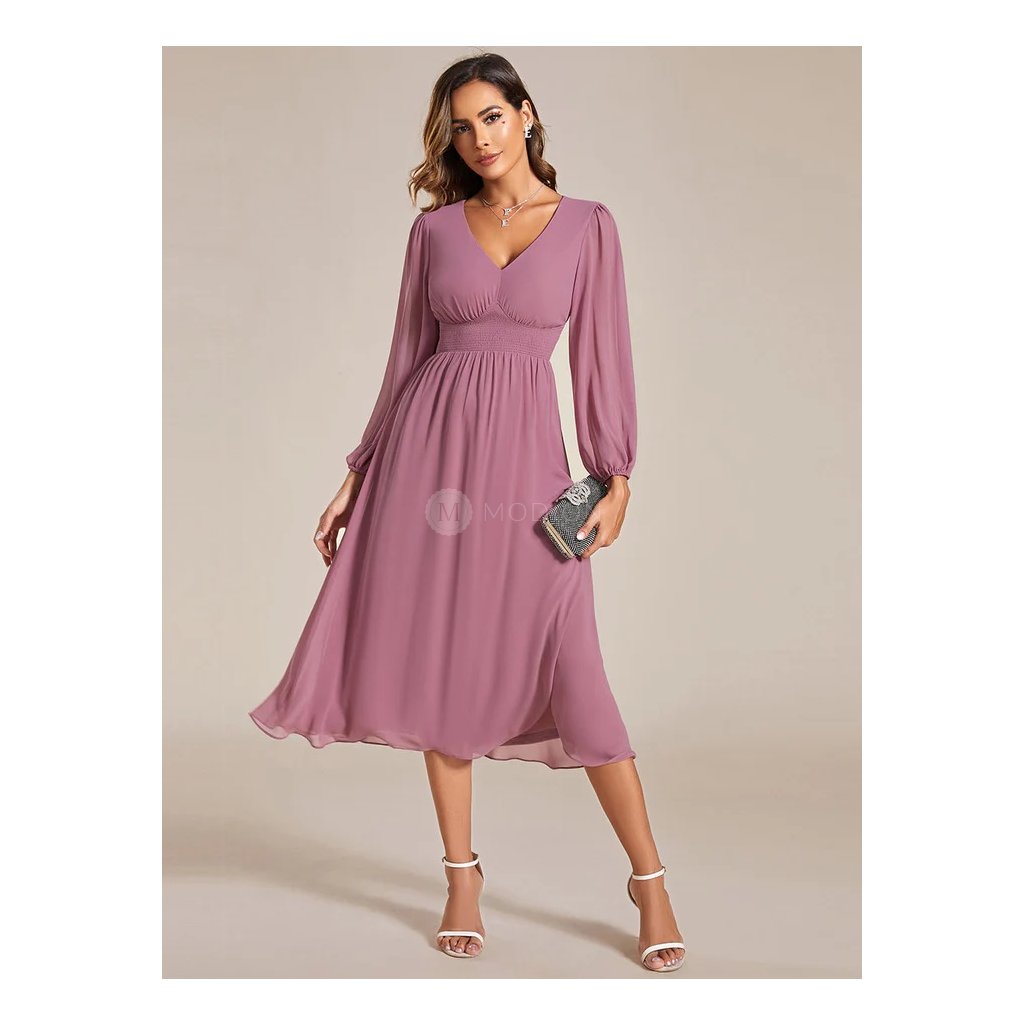 V midi šifonových šatech se budete cítit lehce a elegantně, žabičkový pas lichotí postavě a dlouhé rukávy dodají jemný romantický půvab.