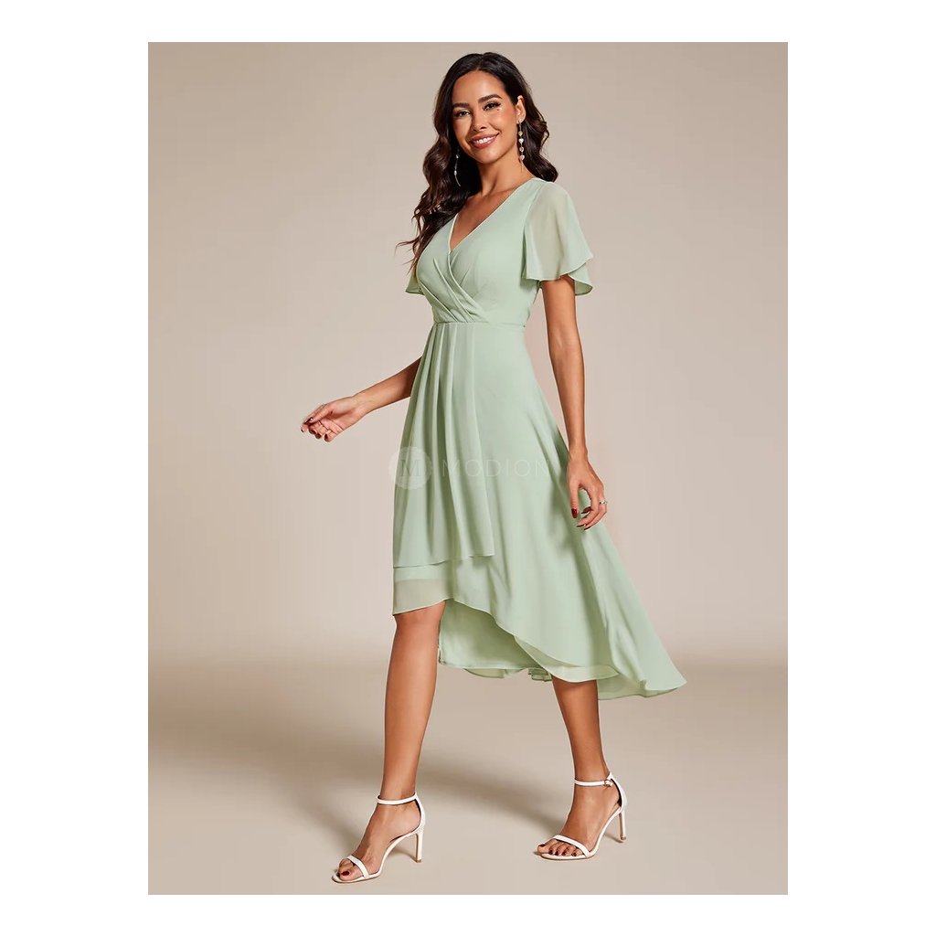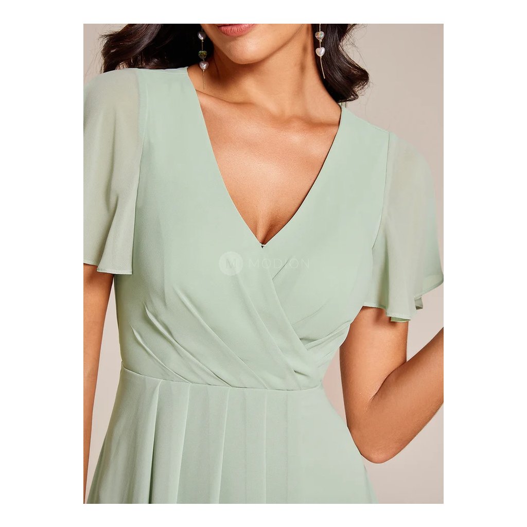 Světle zelené mátové šaty z lehkého šifonu působí svěže a jemně. Výstřih do V zvýrazní dekolt, krátké rukávy dodávají vzdušnost a zároveň poskytují decentní zakrytí paží. Od pasu se šaty rozšiřují do vrstvené sukně s jemnými sklady, která má asymetrický střih – vpředu kratší a vzadu delší. Tento efekt opticky protahuje siluetu a působí elegantně při každém kroku.