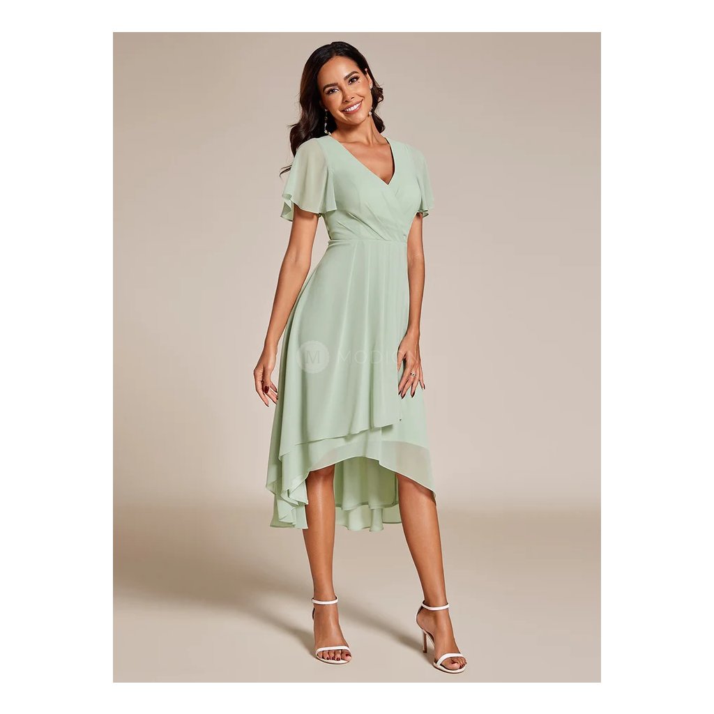 Společenské šaty Phencia: Mátově zelené midi šaty z lehkého šifonu s vrstvenou asymetrickou sukní na svatbu i ples.