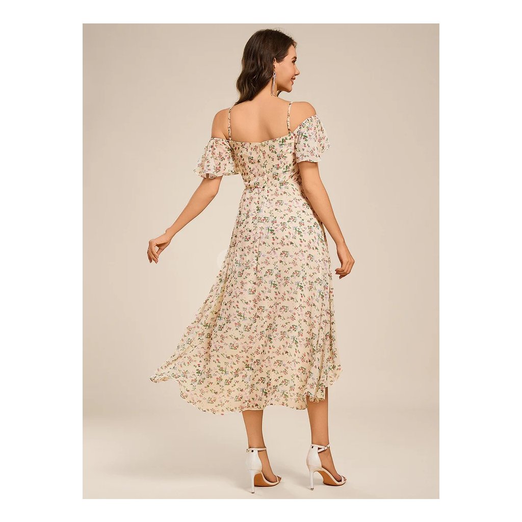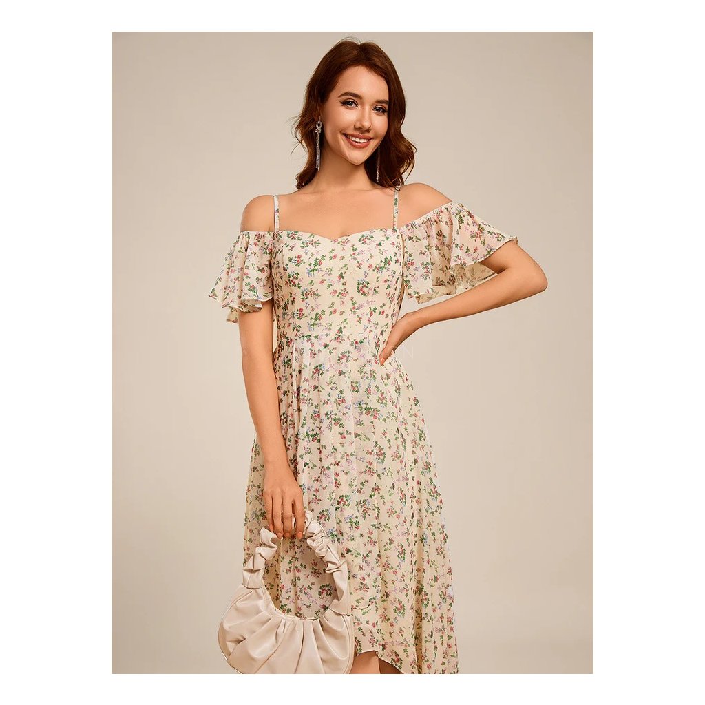 Drobné letní květy na světlém podkladu dodávají šatům hravost a romantický nádech. Tento model je ideální pro letní svatby, zahradní oslavy, večírky i taneční. Skvěle se hodí také na dovolené nebo letní společenské akce, kde chcete zazářit v lehkém a vzdušném outfitu.