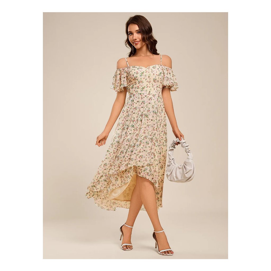 Šaty z lehkého šifonu s drobným květinovým vzorem působí romanticky a svěže. Asymetrický střih s kratší přední částí a prodlouženým zadním dílem opticky protahuje siluetu a dodává modelu lehkost. Tenká ramínka v kombinaci se spadenými rukávy decentně odhalují ramena a zvýrazňují ženský půvab. Áčková sukně s jemným plisováním se při chůzi ladně pohybuje a působí vzdušně.
