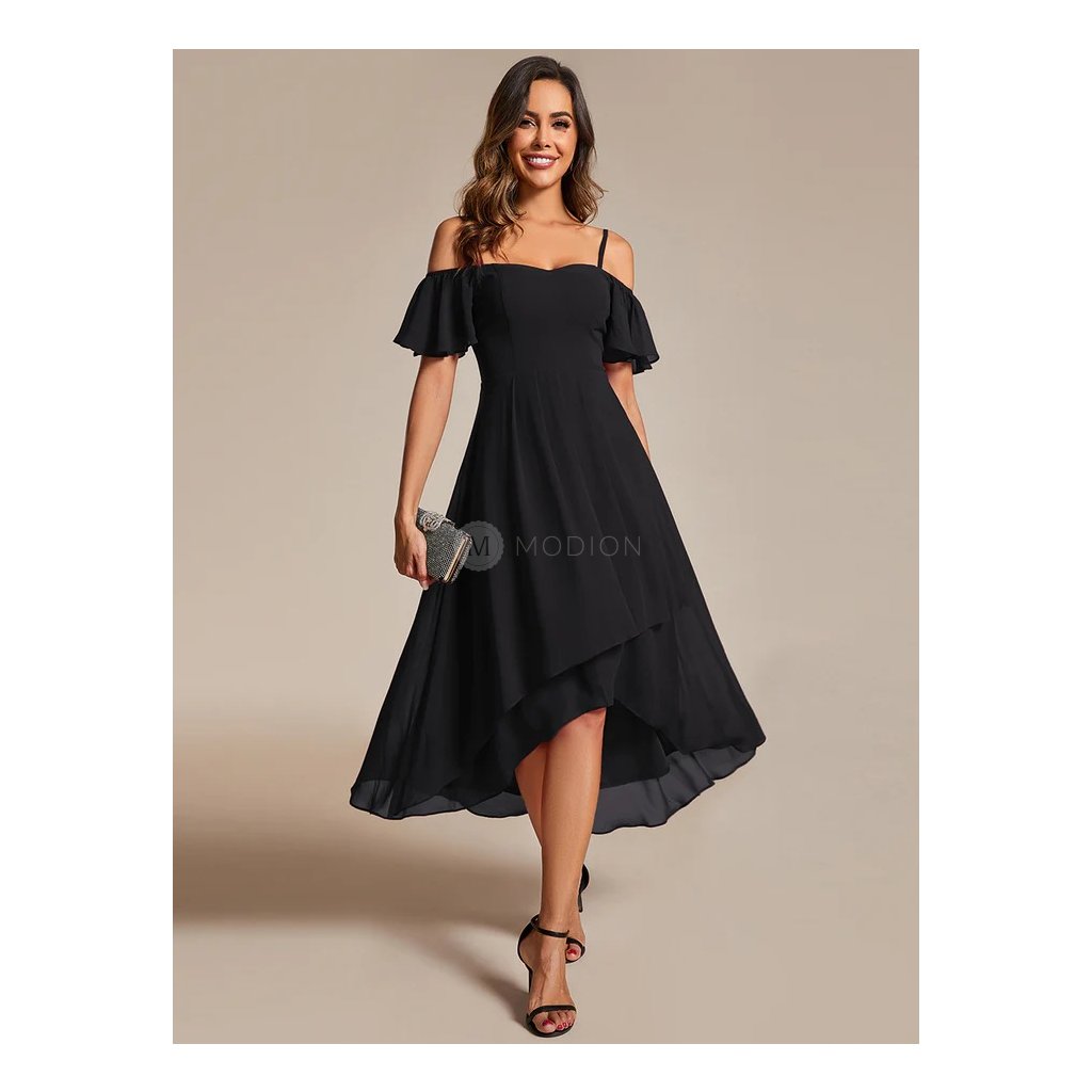 Lehký šifon dodává šatům vzdušnost a plynulý pohyb při chůzi i tanci. Asymetrická délka vytváří moderní a atraktivní siluetu, která působí svěže a elegantně. Odhalená ramena s jemnými rukávky a tenká ramínka zvýrazňují horní linii postavy a dodávají modelu ženský, lehce smyslný nádech. Projmutý živůtek krásně tvaruje pas a podtrhuje vyvážený, velmi lichotivý vzhled celého modelu.