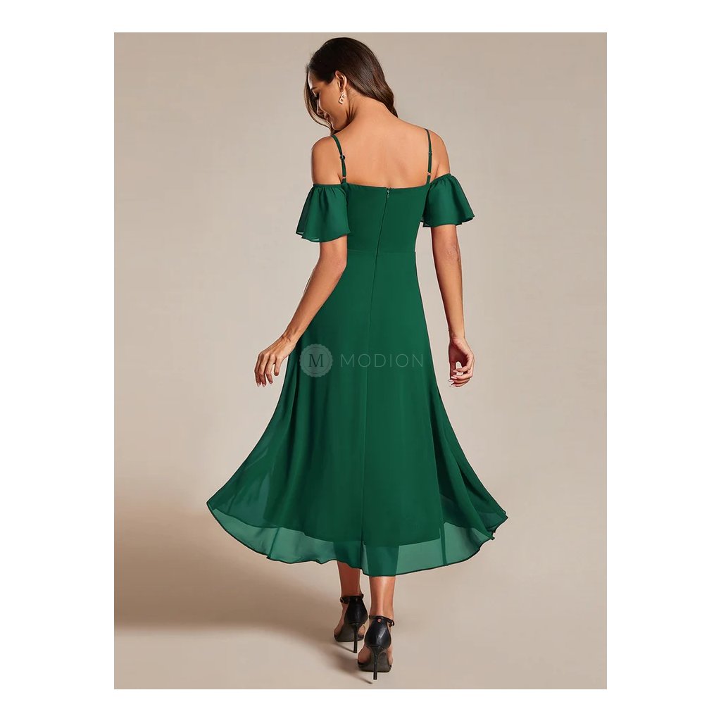 Tmavě zelené smaragdové šaty z lehkého šifonu působí luxusně a elegantně. Asymetrický střih s kratší přední částí a prodlouženým zadním dílem opticky prodlužuje postavu a dodává modelu svěží lehkost. Tenká ramínka doplňují spadené rukávy, které krásně zvýrazňují ramena a dodávají ženský půvab. Áčková sukně s jemnými plisovanými sklady volně splývá a při pohybu působí vzdušně a ladně.