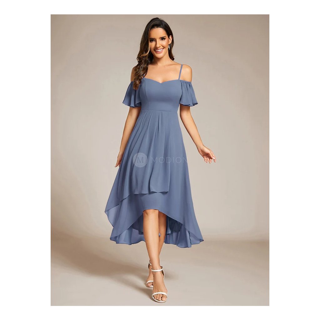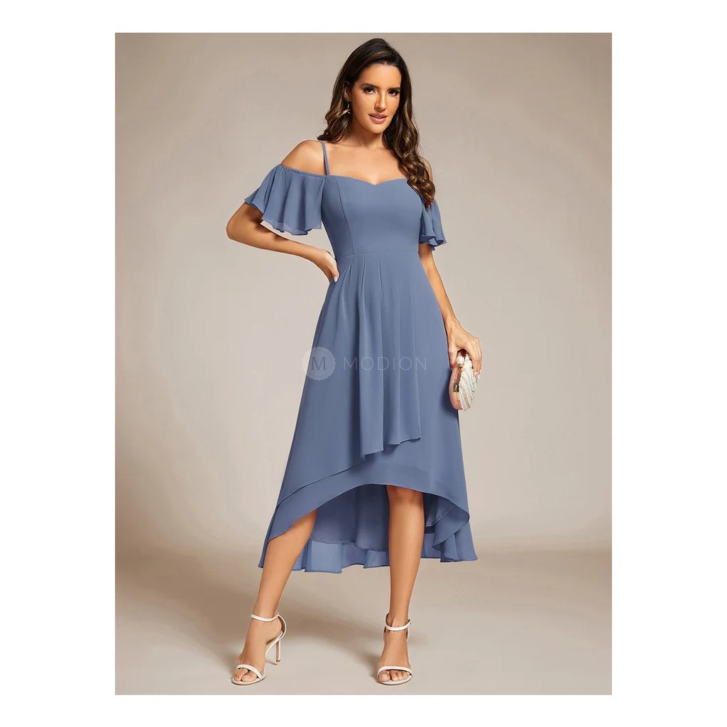 Lehký šifon dodává šatům vzdušnost a plynulý pohyb při chůzi i tanci. Asymetrická délka vytváří moderní a atraktivní siluetu, která působí lehce a elegantně. Odhalená ramena s jemnými rukávky a tenká ramínka zvýrazňují horní linii postavy, zatímco projmutý živůtek hezky tvaruje pas a podtrhuje ženské křivky. Celkový vzhled je vyvážený, nadčasový a velmi reprezentativní.
