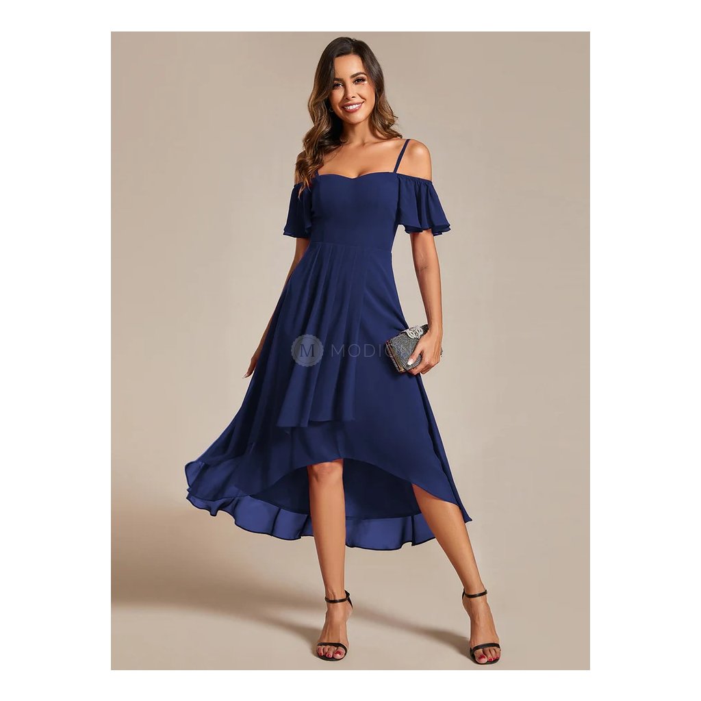 Lehký šifon dodává šatům vzdušnost a plynulý pohyb při chůzi i tanci. Asymetrická délka vytváří moderní a atraktivní siluetu, která působí lehce a elegantně. Odhalená ramena s jemnými rukávky a tenká ramínka zvýrazňují horní linii postavy, zatímco projmutý živůtek hezky tvaruje pas a podtrhuje ženské křivky. Celkový vzhled je harmonický, vyvážený a velmi reprezentativní.