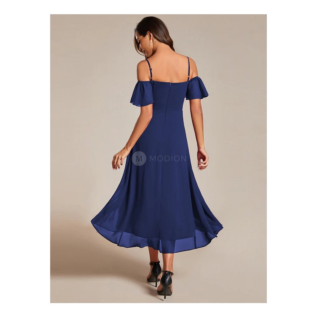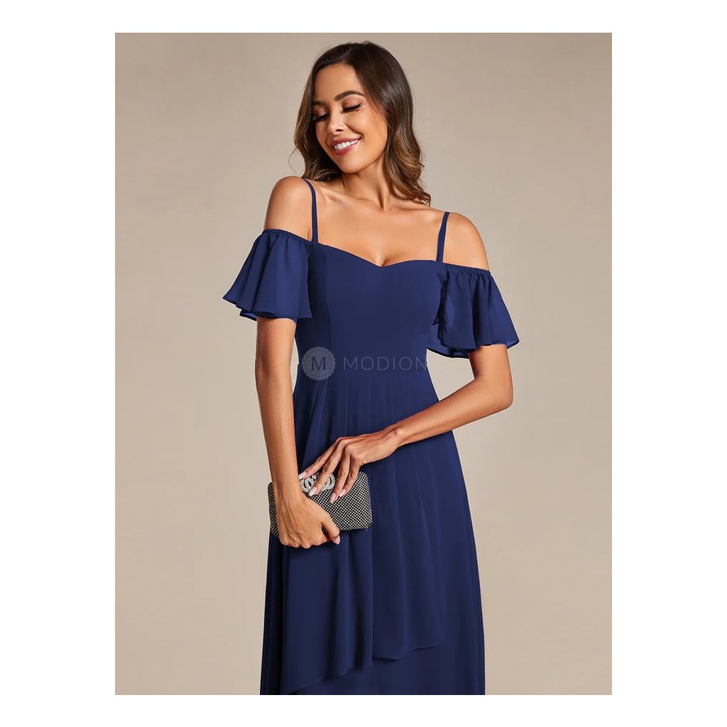 Tmavě modré šaty z lehkého šifonu působí slavnostně a nadčasově. Asymetrický střih s kratší přední částí a prodlouženým zadním dílem opticky prodlužuje postavu a dodává modelu lehkost. Tenká ramínka v kombinaci se spadenými rukávy decentně odhalují ramena a podtrhují ženskou eleganci. Áčková plisovaná sukně se při chůzi ladně pohybuje a působí vzdušně.