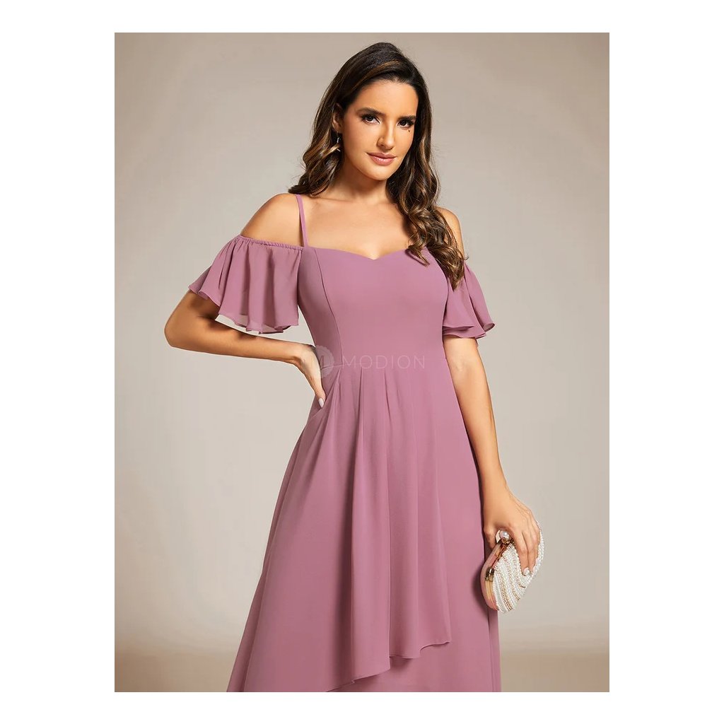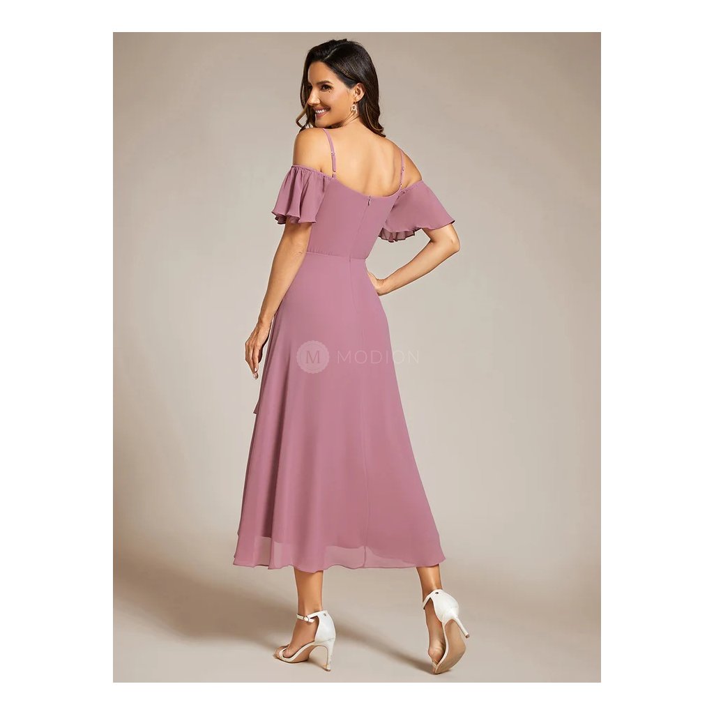 Starorůžové šaty z lehkého šifonu působí romanticky a elegantně. Asymetrický střih s kratší přední částí a prodlouženým zadním dílem opticky prodlužuje postavu a dodává modelu vzdušnost. Tenká ramínka doplňují spadené rukávy, které jemně odhalují ramena a podtrhují ženský půvab. Áčková plisovaná sukně se při chůzi ladně pohybuje a vytváří působivý efekt.