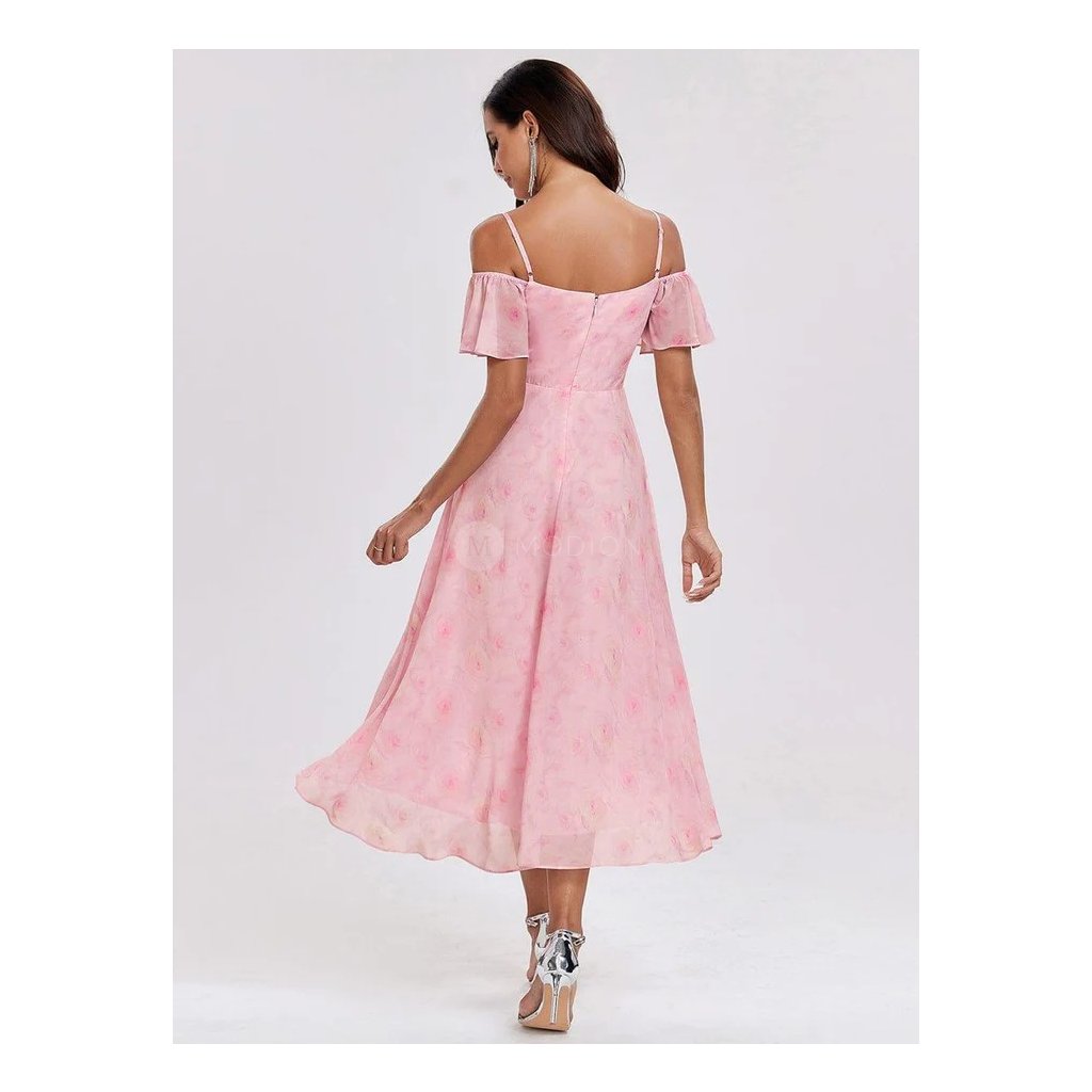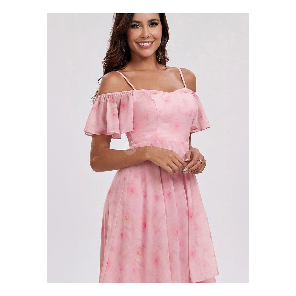 Midi růžové společenské šaty v šifonovém provedení se splývavým střihem a vzorem působí jemně, romanticky a velmi elegantně. Růžový tón doplněný dekorativním vzorem dodává modelu svěžest a originální slavnostní charakter.
