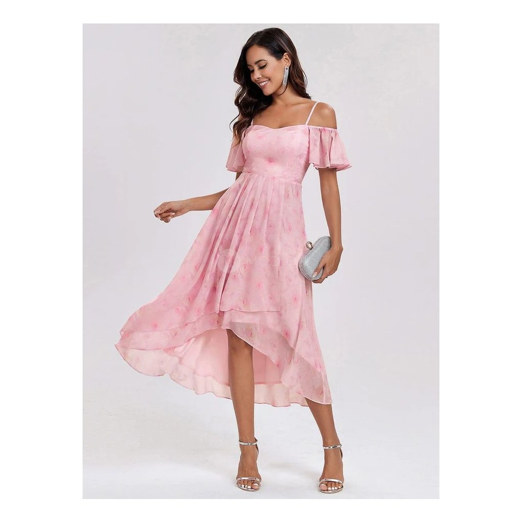 Lehký šifon zajišťuje vzdušnost a plynulý pohyb při chůzi i tanci. Vzor přináší jemný vizuální detail, který model příjemně oživuje. Asymetrická délka vytváří moderní a atraktivní siluetu. Odhalená ramena s lehkými rukávky v kombinaci s tenkými ramínky zvýrazňují horní linii postavy, zatímco projmutý živůtek hezky tvaruje pas a podtrhuje ženské proporce.