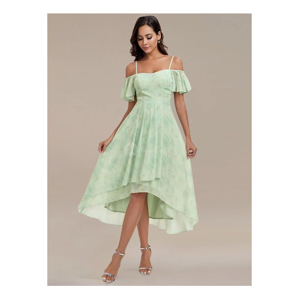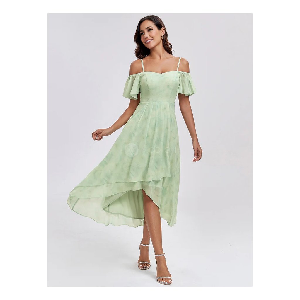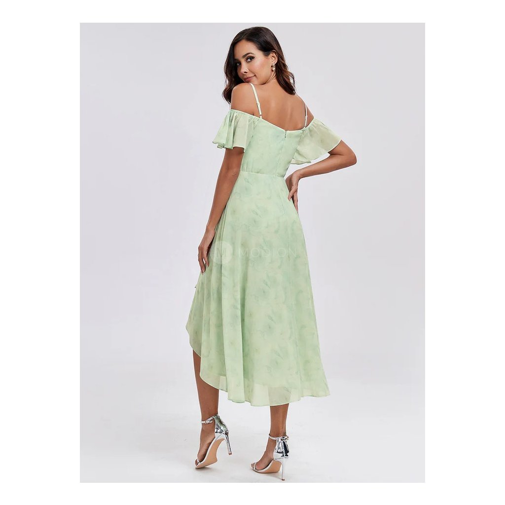 Lehký šifonový materiál dodává šatům vzdušnost a plynulý pohyb při chůzi i tanci, zatímco vzor přináší jemný vizuální akcent. Asymetrická délka vytváří moderní a atraktivní siluetu, odhalená ramena s lehkými rukávky a tenká ramínka zvýrazňují horní linii postavy. Projmutý živůtek hezky tvaruje pas a podtrhuje ženské proporce. Celek působí harmonicky, lehce a velmi vkusně.