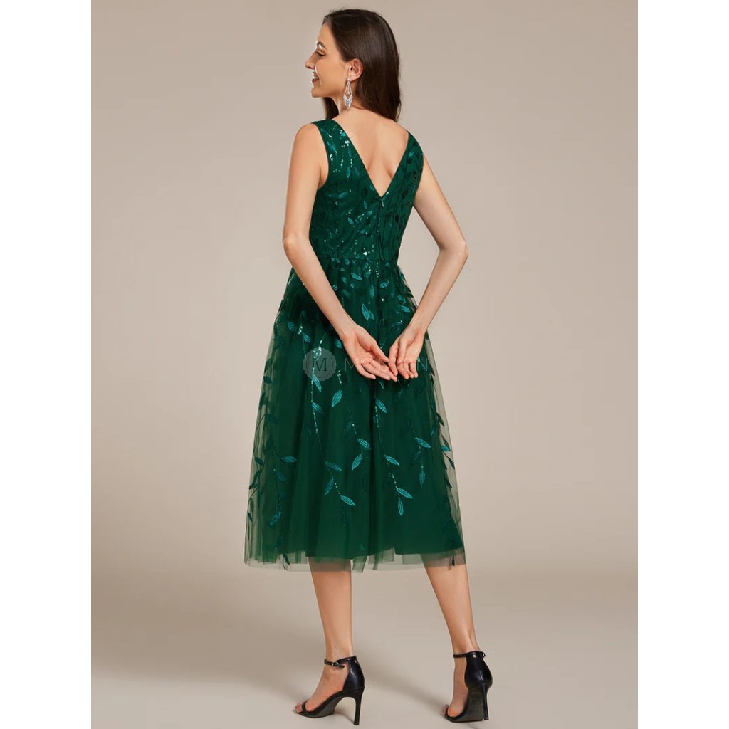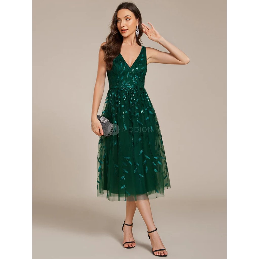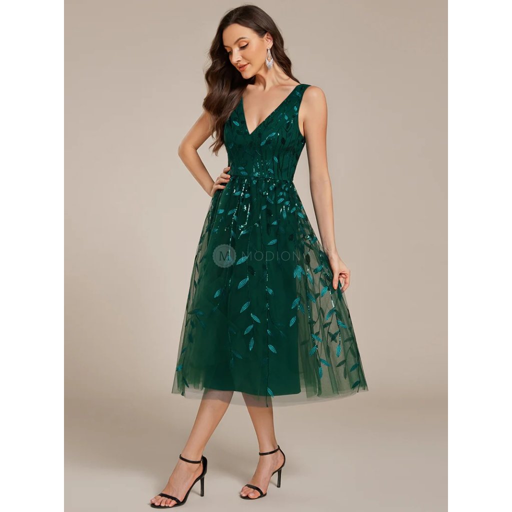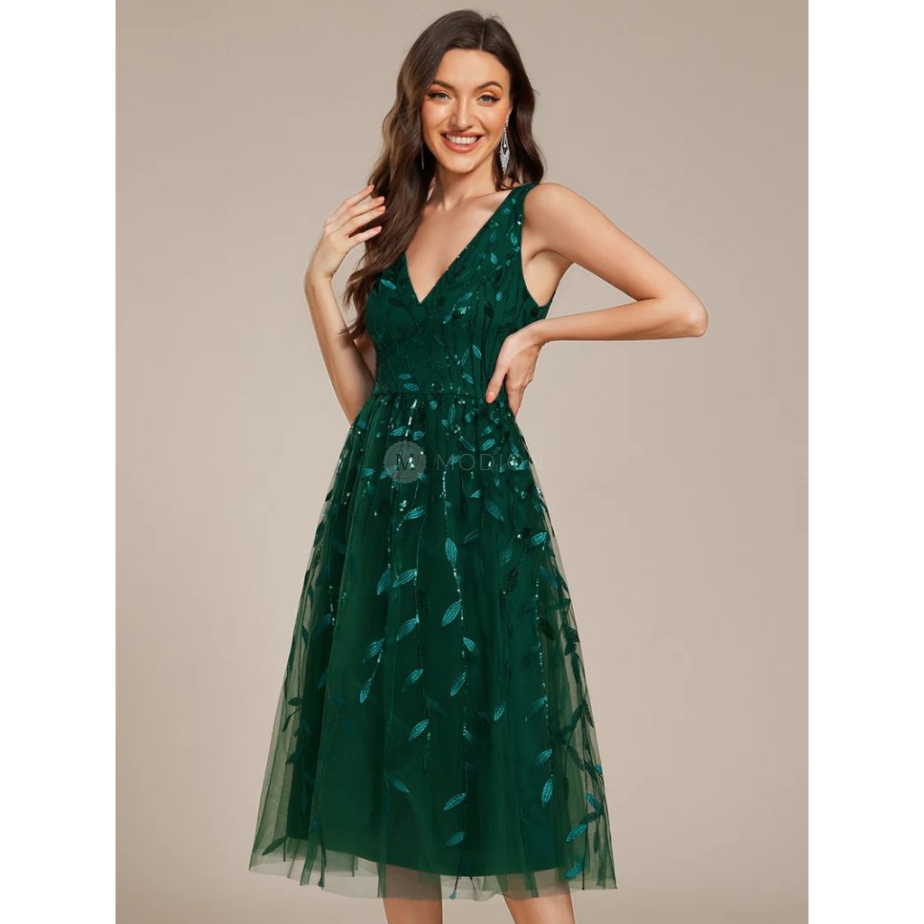 Zelené společenské šaty v midi délce působí svěže, elegantně a slavnostně. Zelený odstín dodává modelu přirozený a vyvážený výraz, který se hodí pro široké spektrum společenských i formálních příležitostí.