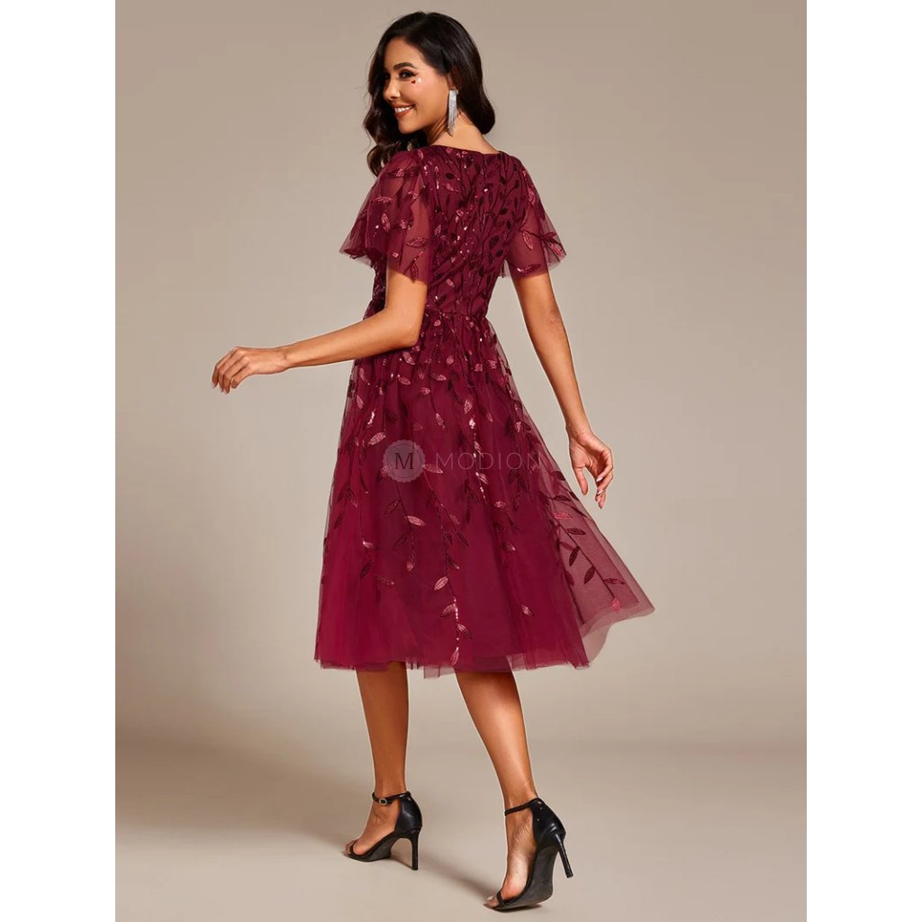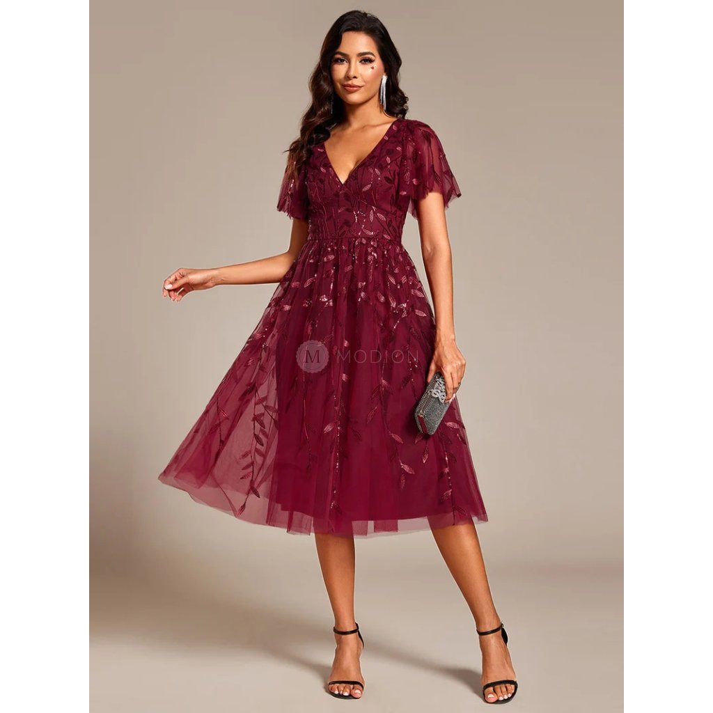 Červené vínové společenské šaty zaujmou noblesním vzhledem a precizním zpracováním. Jsou ušity z lehkého tylu zdobeného flitrovým ornamentálním vzorem tón v tónu, který jim dodává třpyt a eleganci. Hluboký výstřih do V působí smyslně a opticky prodlužuje postavu, krátké rukávy dodávají jemnost a vzdušnost. Áčková midi sukně v délce pod kolena se při chůzi i tanci krásně vlní a vytváří nadýchaný efekt.