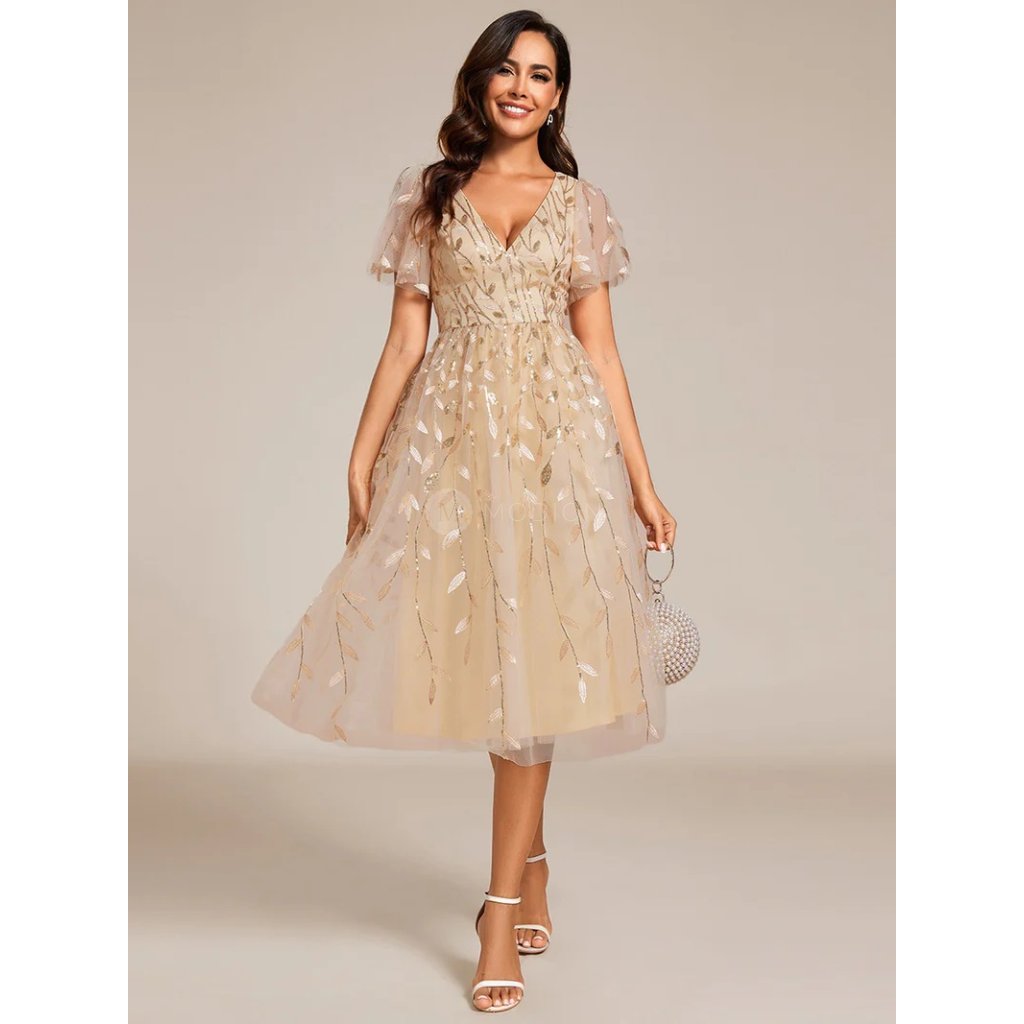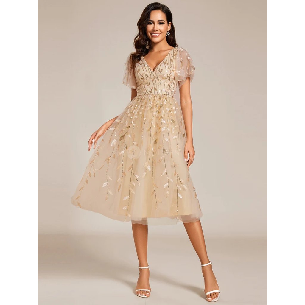 Midi zlaté společenské šaty z jemného tylu s hlubokým výstřihem působí slavnostně, luxusně a velmi reprezentativně. Jsou ideální volbou pro ženy, které hledají elegantní model s decentním třpytem pro formálnější a večerní události.