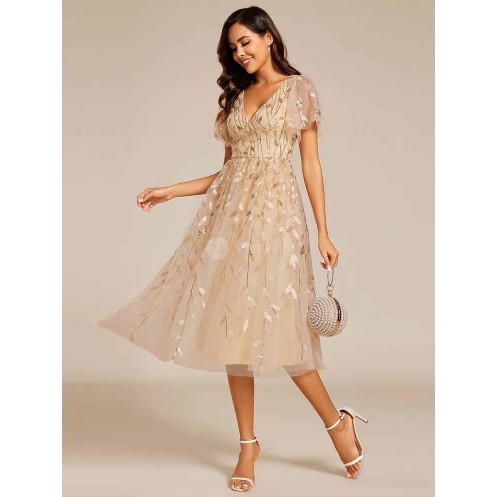 Krémově zlaté společenské šaty v midi délce pod kolena působí luxusně a slavnostně. Jemný tyl zdobí ornamentální flitrový vzor v tónu šatů, který se krásně třpytí a dodává modelu výjimečný vzhled. Hluboký výstřih do V působí svůdně a opticky zeštíhluje postavu, krátké rukávy z lehkého tylu přidávají jemnost a vzdušnost. Áčková sukně s lehce nadýchaným efektem elegantně splývá a vytváří půvabnou siluetu.