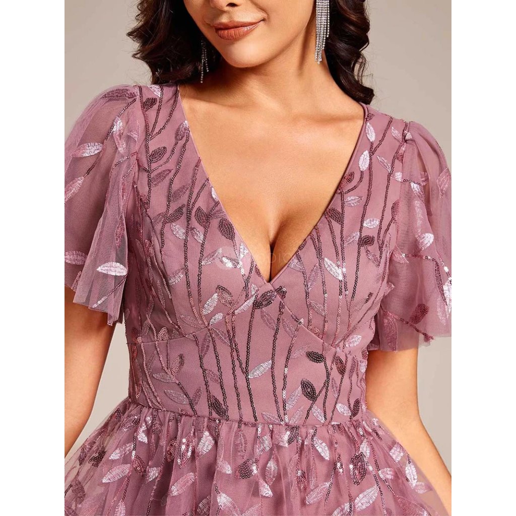 Starorůžové společenské šaty v odstínu orchidej působí něžně a romanticky. Jemný tyl je zdoben třpytivým flitrovým vzorem tón v tónu, který šatům dodává slavnostní charakter a zářivý vzhled. Hluboký výstřih do V vytváří půvabnou linii dekoltu, krátké rukávy z lehkého tylu přinášejí jemnost a vzdušnost. Áčková midi sukně v délce pod kolena je lehce nadýchaná a při pohybu se krásně vlní.