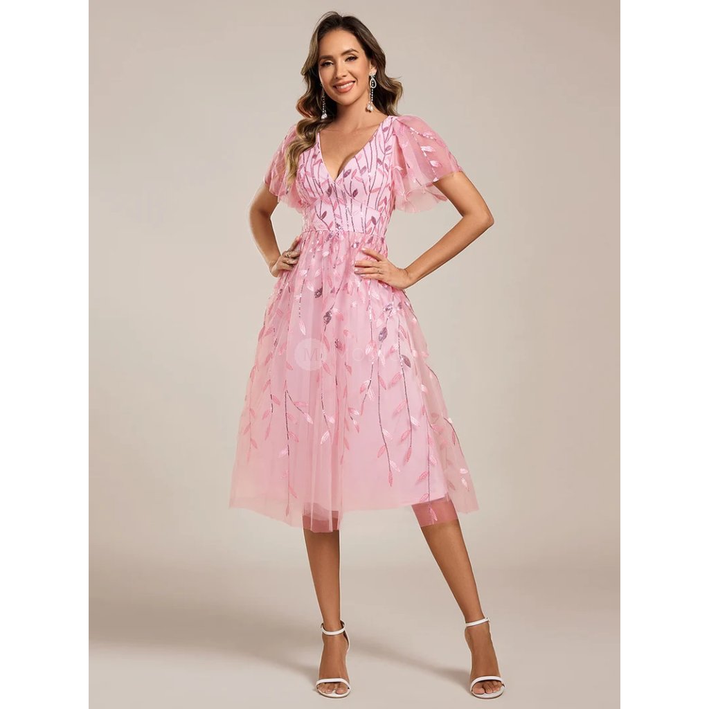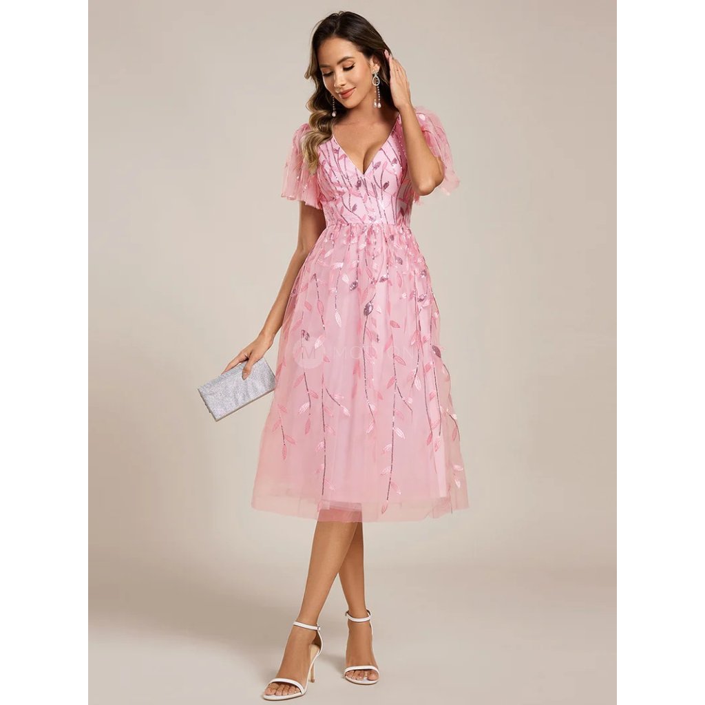 Lehký tyl zachovává vzdušnost a jemný pohyb při chůzi. Véčkový výstřih krásně lichotí dekoltu a zvýrazňuje ženskou siluetu. Krátké průsvitné rukávy zjemňují celkový vzhled a dodávají šatům lehkost. Přirozeně projmutý pas zvýrazňuje postavu a sukně v midi délce pod kolena působí elegantně, splývavě a velmi vkusně.