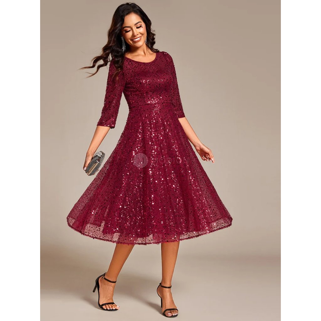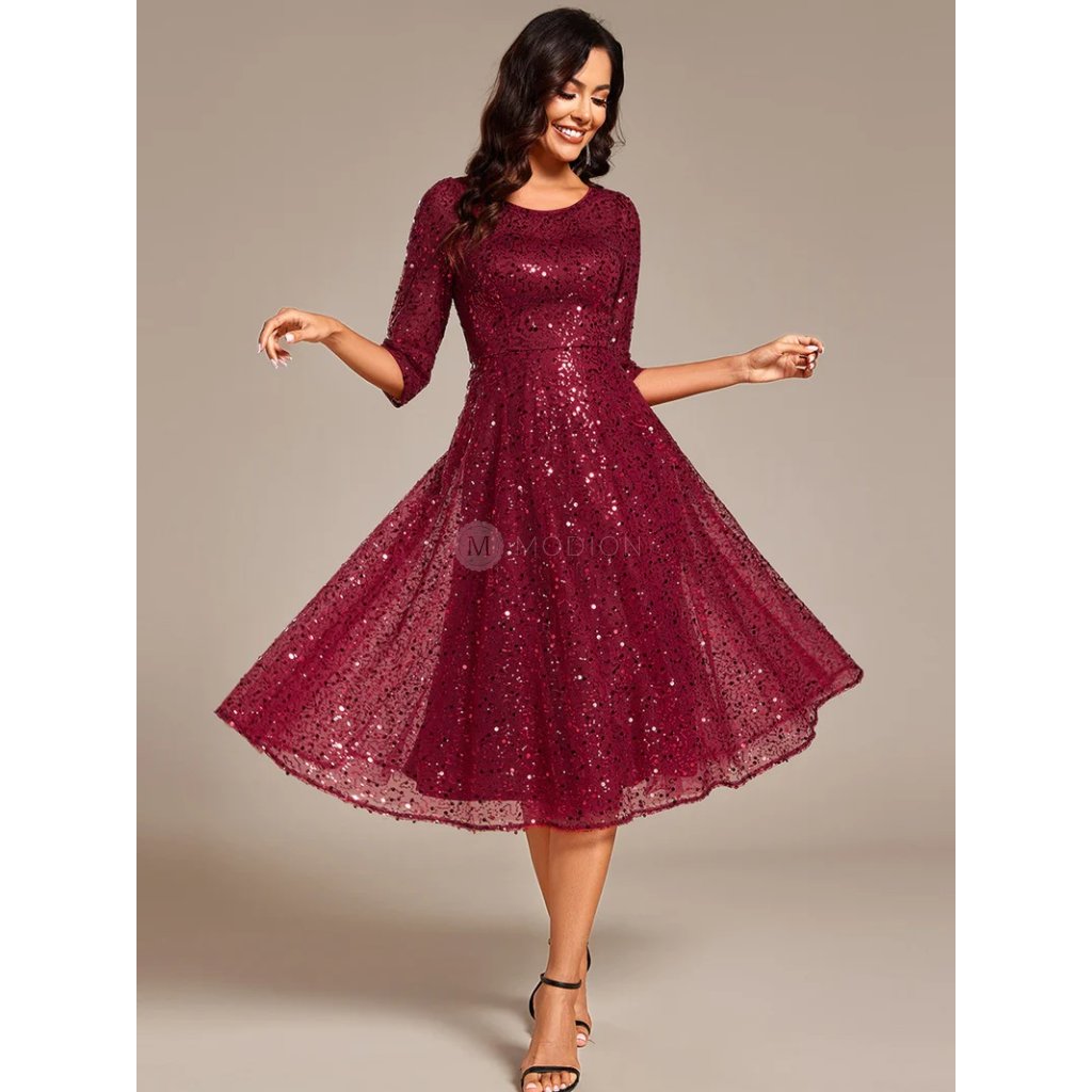 Třpytivý flitrový materiál dodává šatům luxusní charakter a krásně vyniká při pohybu i večerním osvětlení. Jemně rozšířená sukně vytváří ladnou a ženskou siluetu, zatímco tříčtvrteční rukávy spolu s kulatým výstřihem působí decentně a elegantně. Midi délka podtrhuje slavnostní charakter modelu a zároveň zajišťuje pohodlí při nošení. Celkový dojem je vyvážený, ženský a nadčasový.