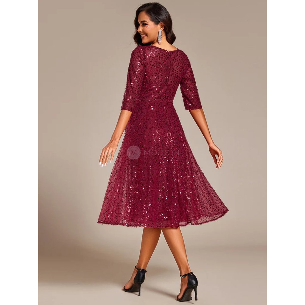 Midi vínově červené společenské šaty působí smyslně, elegantně a velmi slavnostně. Jsou ideální volbou pro ženy, které hledají výrazný večerní model s vyváženým a vkusným vzhledem.