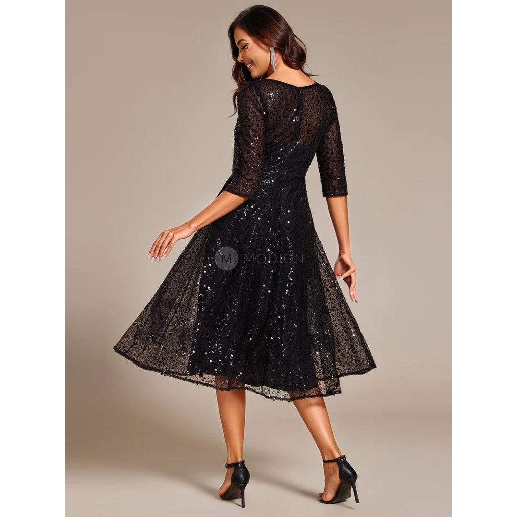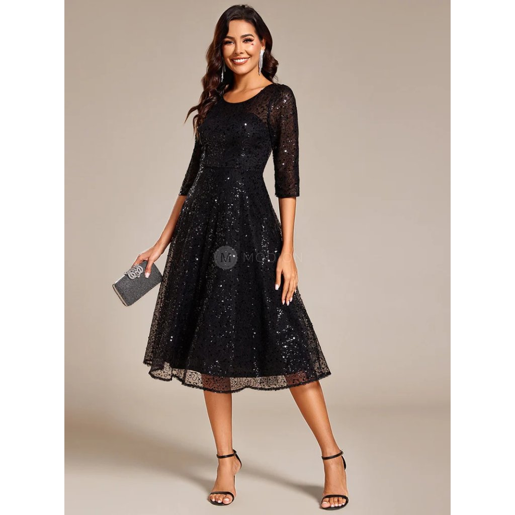 Midi černé společenské šaty s flitrovým zdobením a polovičním rukávem působí elegantně, slavnostně a velmi žensky. Jsou ideální volbou pro ženy, které hledají vyvážený model s výrazným třpytem a zároveň decentním, vkusným vzhledem.