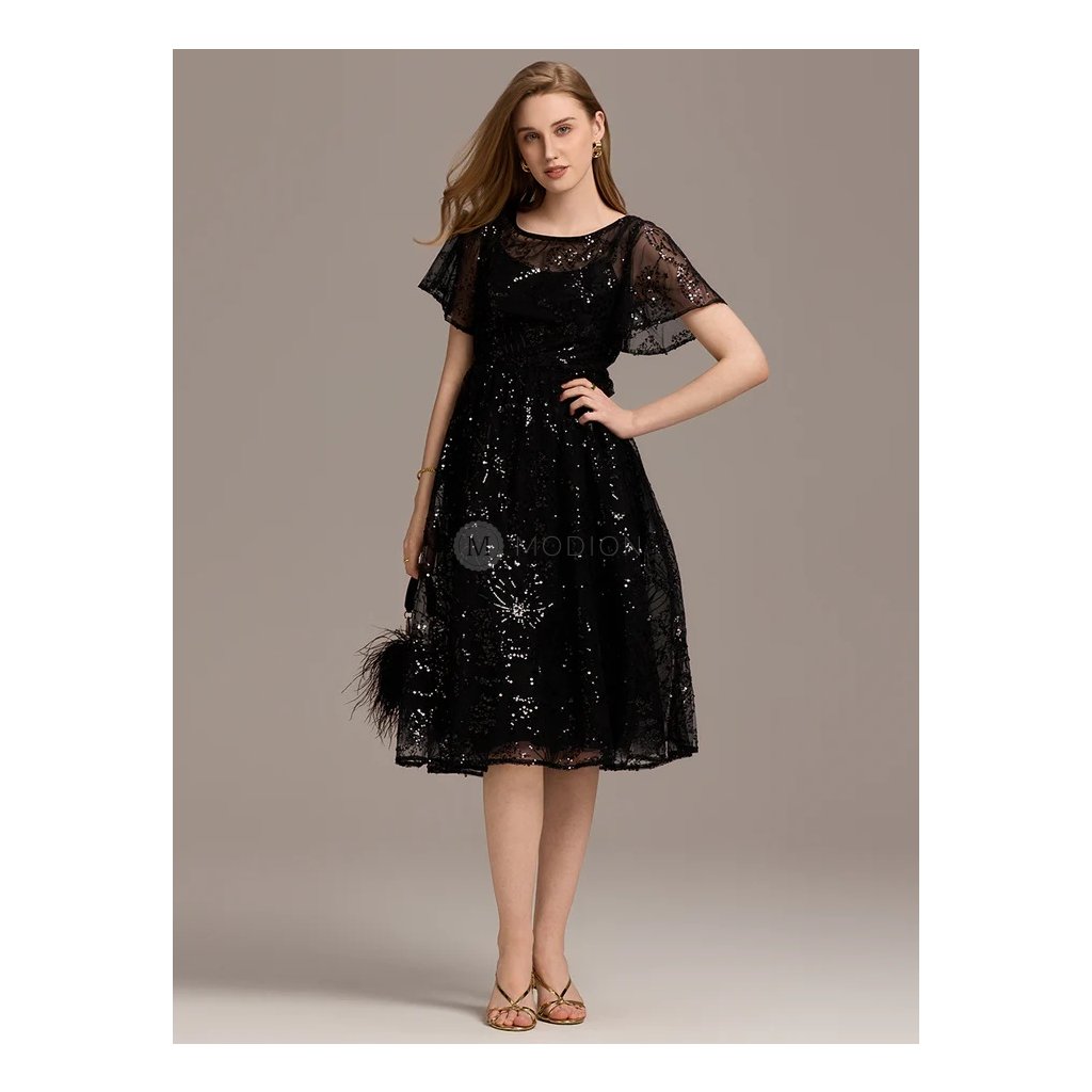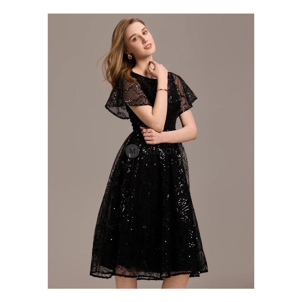 Midi černé společenské šaty z jemného tylu s celozdobeným třpytivým vzorem působí elegantně, nadčasově a velmi vkusně. Jsou ideální volbou pro ženy, které hledají univerzální slavnostní model s decentním leskem.