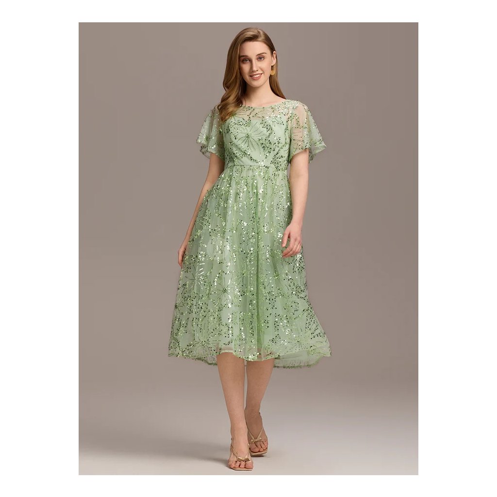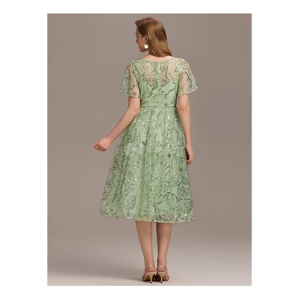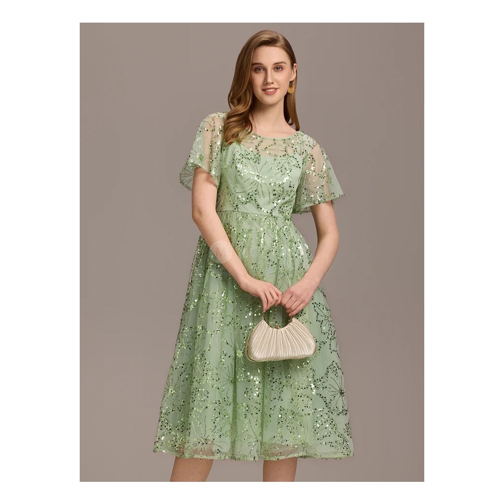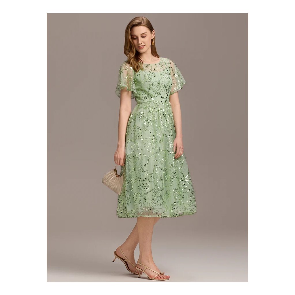 Krátké zelené plesové šaty s délkou pod kolena, zdobené jemným tylem a třpytivými flitry. Kulatý výstřih a vzdušná sukně zvýrazní vaši postavu na každé slavnosti.