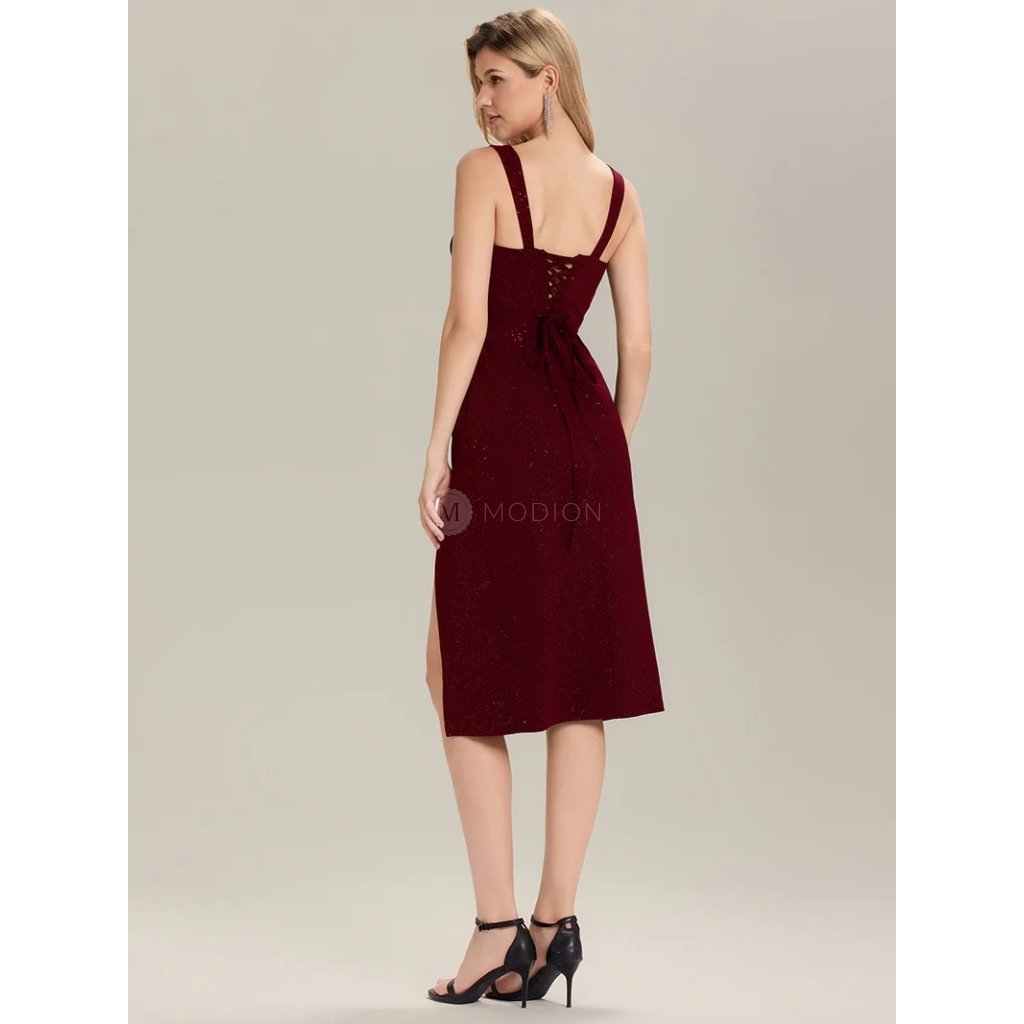 Elegantní vínové společenské šaty podtrhují ženskou siluetu díky poddajnému třpytivému žerzeji. Výstřih zdobený rhinestony přidává luxusní detail, rozparek do délky pod kolena zajišťuje svůdný efekt a ramínka poskytují pohodlnou oporu. Praktické šněrování na zádech umožňuje přizpůsobit šaty postavě.