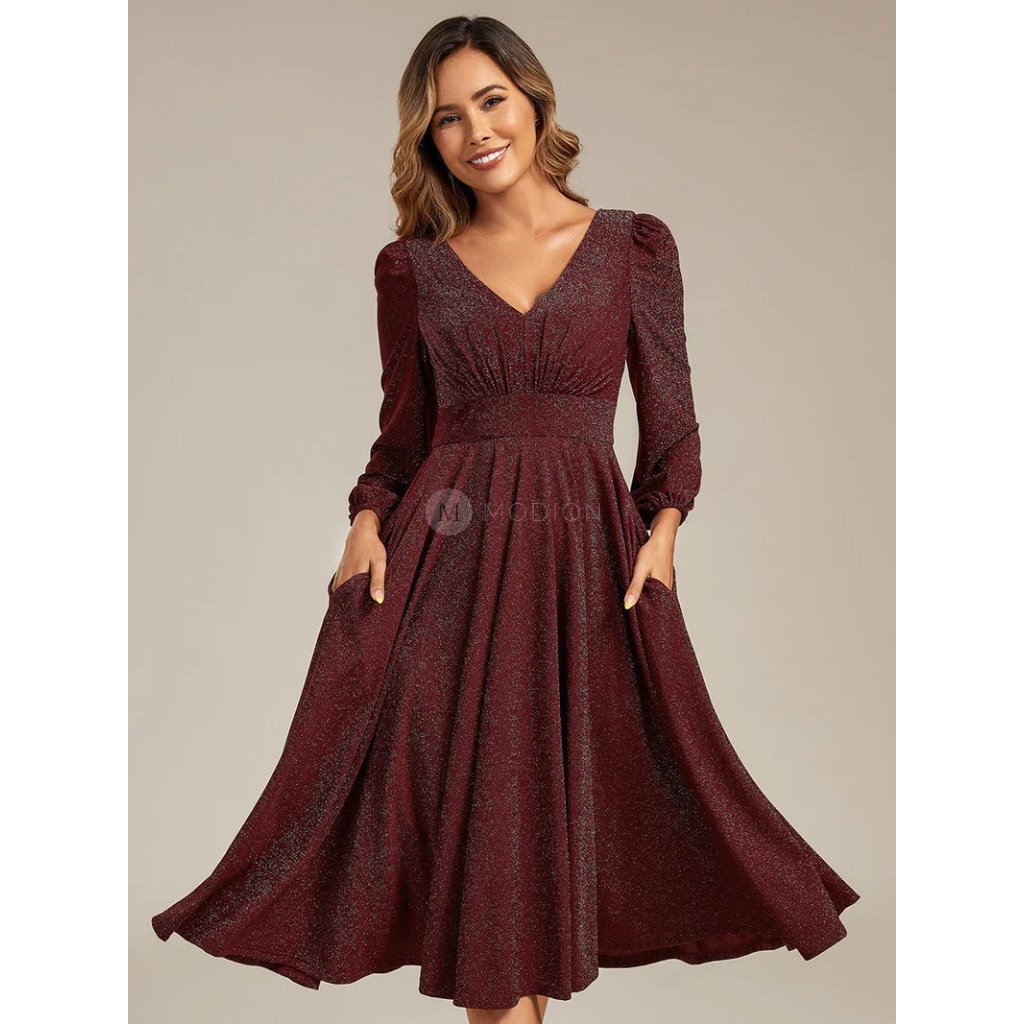 Jemně třpytivý materiál dodává šatům luxusní vzhled a vytváří elegantní efekt při pohybu i pod umělým osvětlením. Výstřih do V zvýrazňuje dekolt a opticky prodlužuje siluetu, zatímco dlouhé rukávy s lehkým řasením dodávají modelu sofistikovaný a vyvážený charakter. Decentně zvýrazněný pas plynule navazuje na rozšířenou midi sukni v délce pod kolena, která krásně splývá a zajišťuje pohodlí při nošení. Praktické boční kapsy jsou nenápadným, ale velmi příjemným detailem, který zvyšuje komfort bez narušení elegantního vzhledu. Celkový dojem je sebevědomý, ženský a nadčasový.