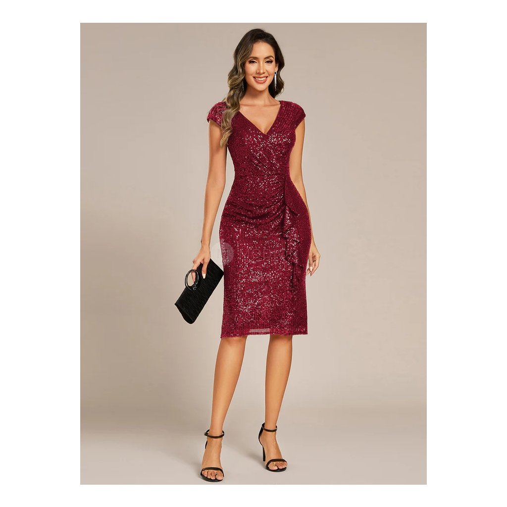 Vypasované vínové koktejlové šaty s volánem na ramínka, midi délka s rozparkem. Mírně poddajný a příjemný materiál, ideální na ples, svatbu i večírek.