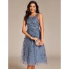 V modrošedých šatech s flitrovým zdobením zazáříte jemnou elegancí, kulatý výstřih působí decentně a tylová sukně dodá romantický půvab.